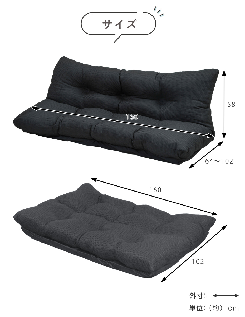 | サイズ | 約 幅160×奥行102×高さ58(cm) リクライニング時:約奥行64~102(cm) |