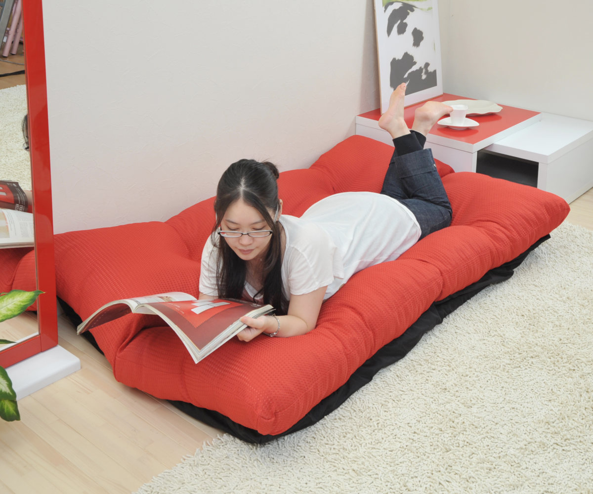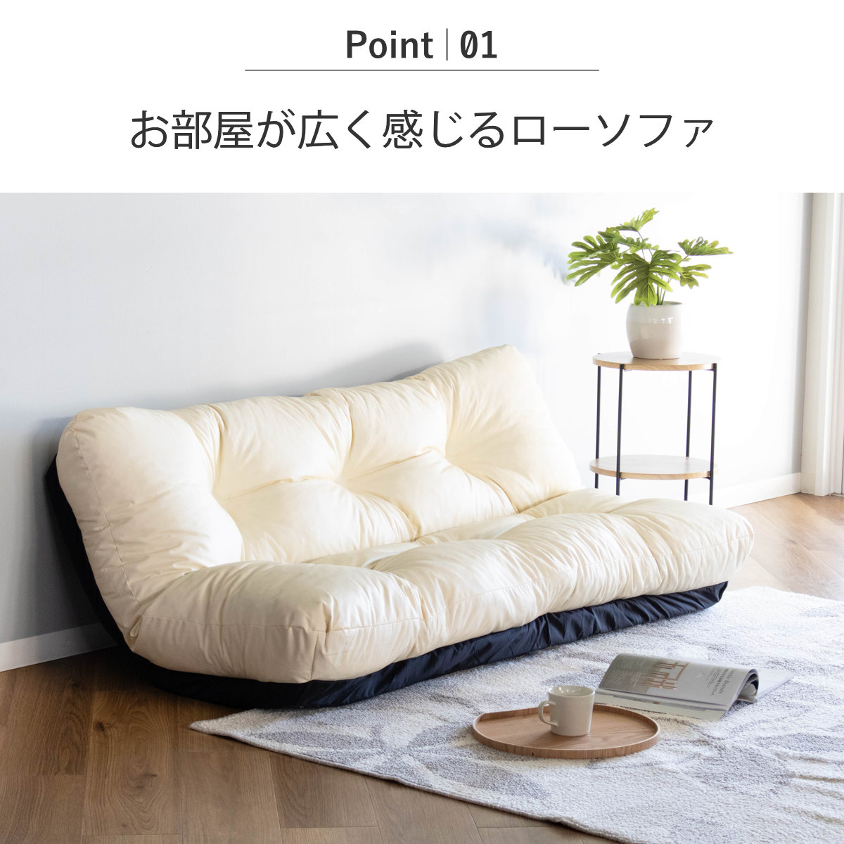脚が無いため目線が低く、お部屋に圧迫感をあたえないのがローソファの大きな魅力。ゆったりとくつろげる幅広座面でありながら、開放感のある空間を演出できます。