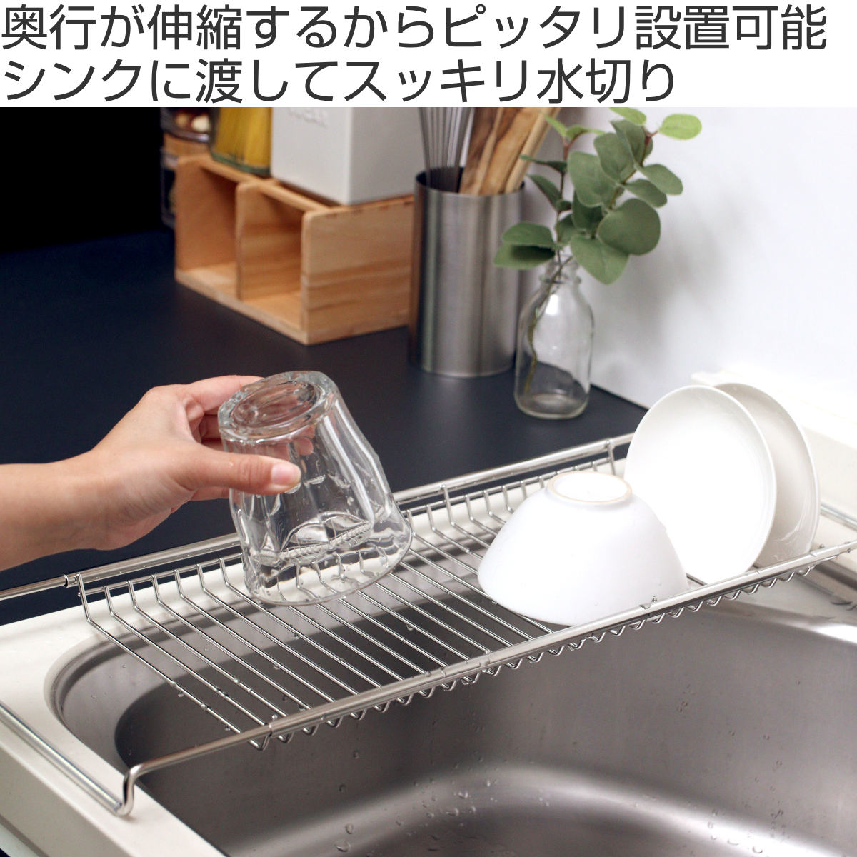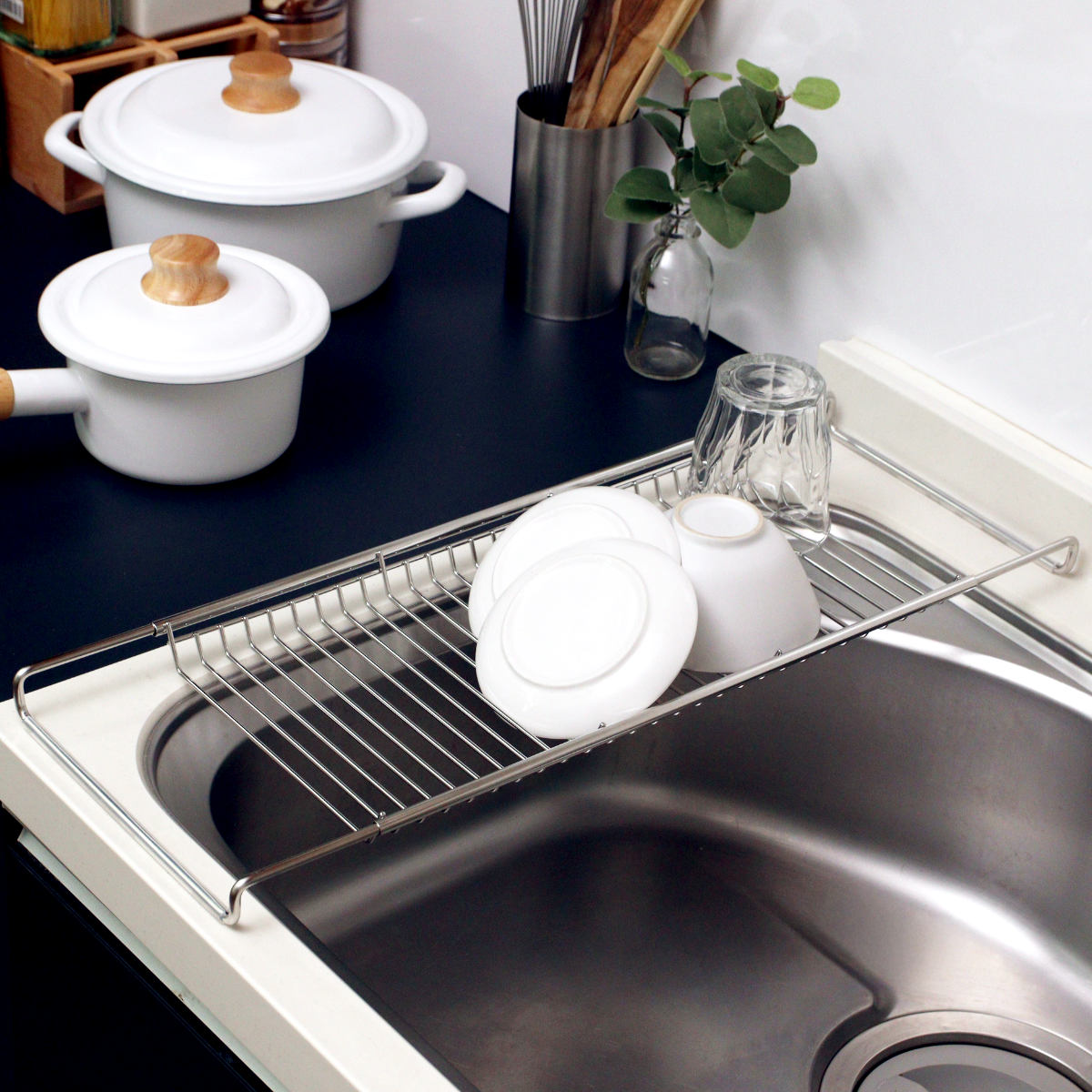 シンクサイズに合わせて伸縮ができる便利なスライド式水切りラックです。水切りスペースをシンク内に持ってくることで、作業スペースを広く使えます。お料理がしやすくなり、見た目もスッキリします。