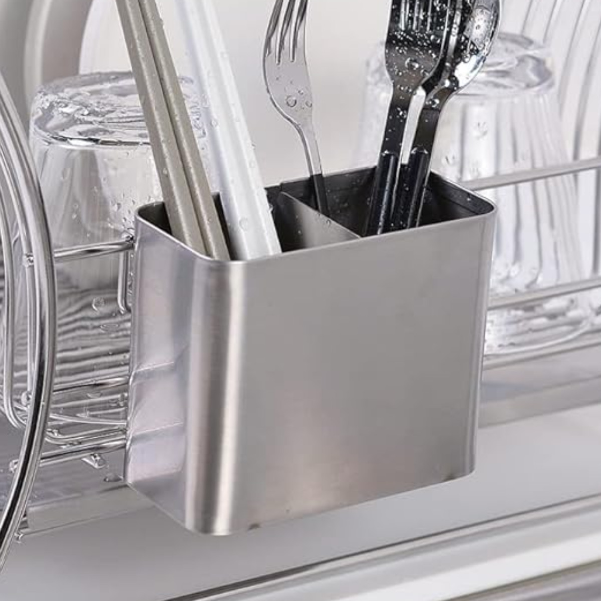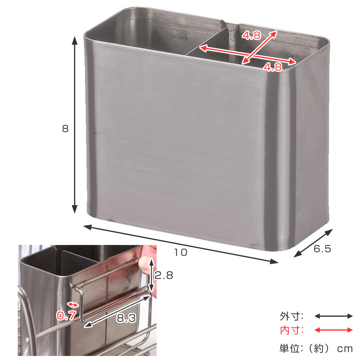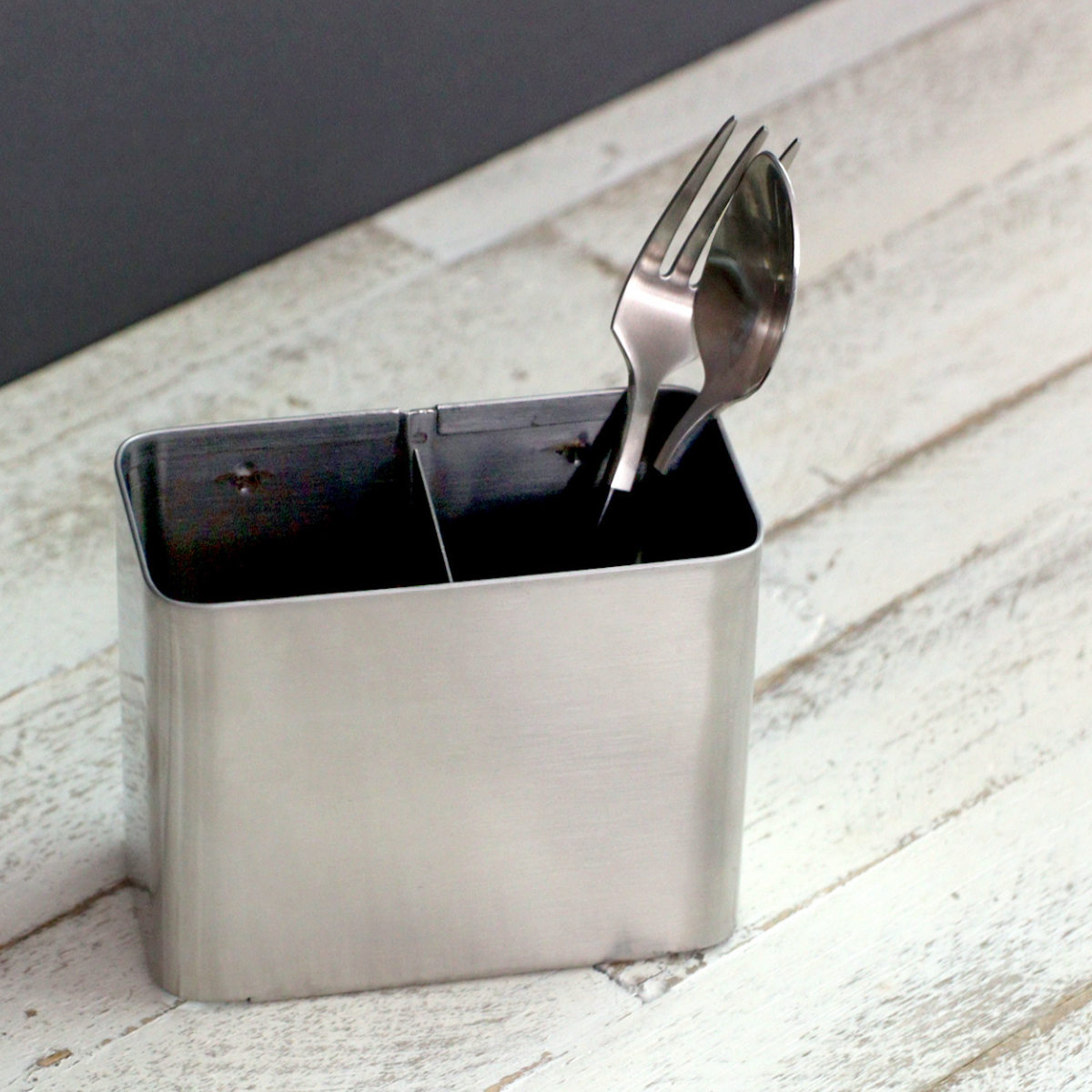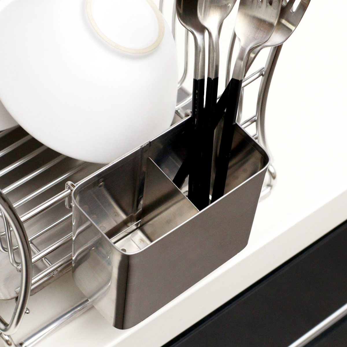 スタイリッシュなオールステンレス製のカトラリーポケットです。使用している水切りかごに引っ掛けるだけで、簡単に水切りスペースを増やすことができます。耐久性に優れたステンレス製で変形しにくく、サビにくい特長もあるのでお手入れが簡単で長く愛用していただけます。