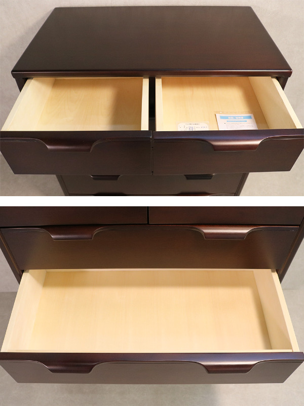 手掛け部分は、マホガニーの無垢材から削り出した手触りの良いデザインです。引出しは丈夫な箱組み仕様で、引出しが最後まで抜け落ちないようにストッパーが付属しています。