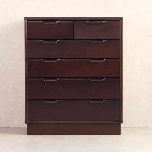 銘木マホガニーを贅沢に使用した、優しいフォルムのチェストです。コンパクトでシンプルなスタイルながら、細かな部分までこだわり、上品で落ち着いた雰囲気です。また、表面にウレタン塗装を施すことで耐久性、耐水性を強化しています。
