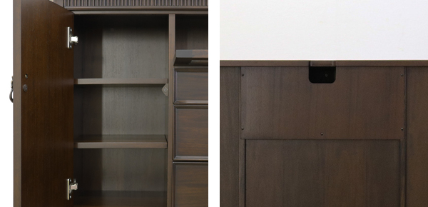 扉のサガリや引出しの取っ手が、ダークブラウンのマホガニー材を引き締め、特別感が漂う雰囲気を演出しています。天板にはリブ(浮き上がる彫刻)を施し、お部屋を洗練されたエレガントな雰囲気に演出してくれます。