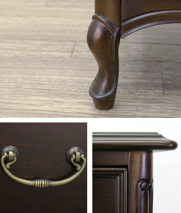脚部をカブリオールレッグ(猫脚)に仕上げ、天板や引出しの前板には彫刻で浮き上がる立体的な飾り縁が施されています。繊細な装飾が施された取っ手は、ダークブラウンのマホガニー材を引き締め、特別感が漂う雰囲気を演出しています。