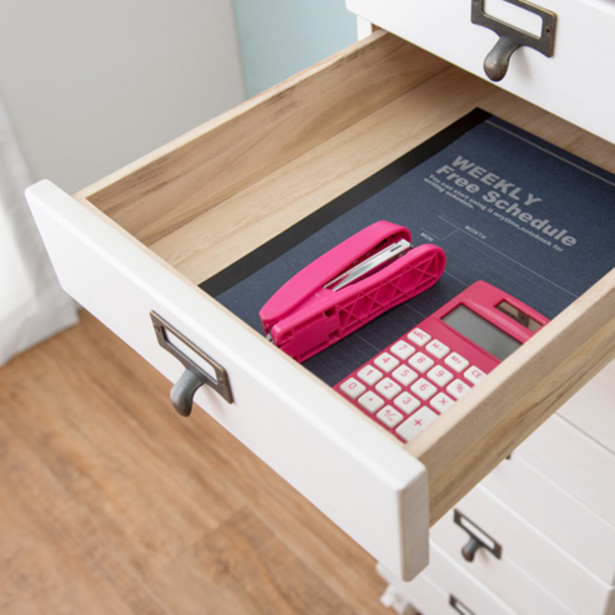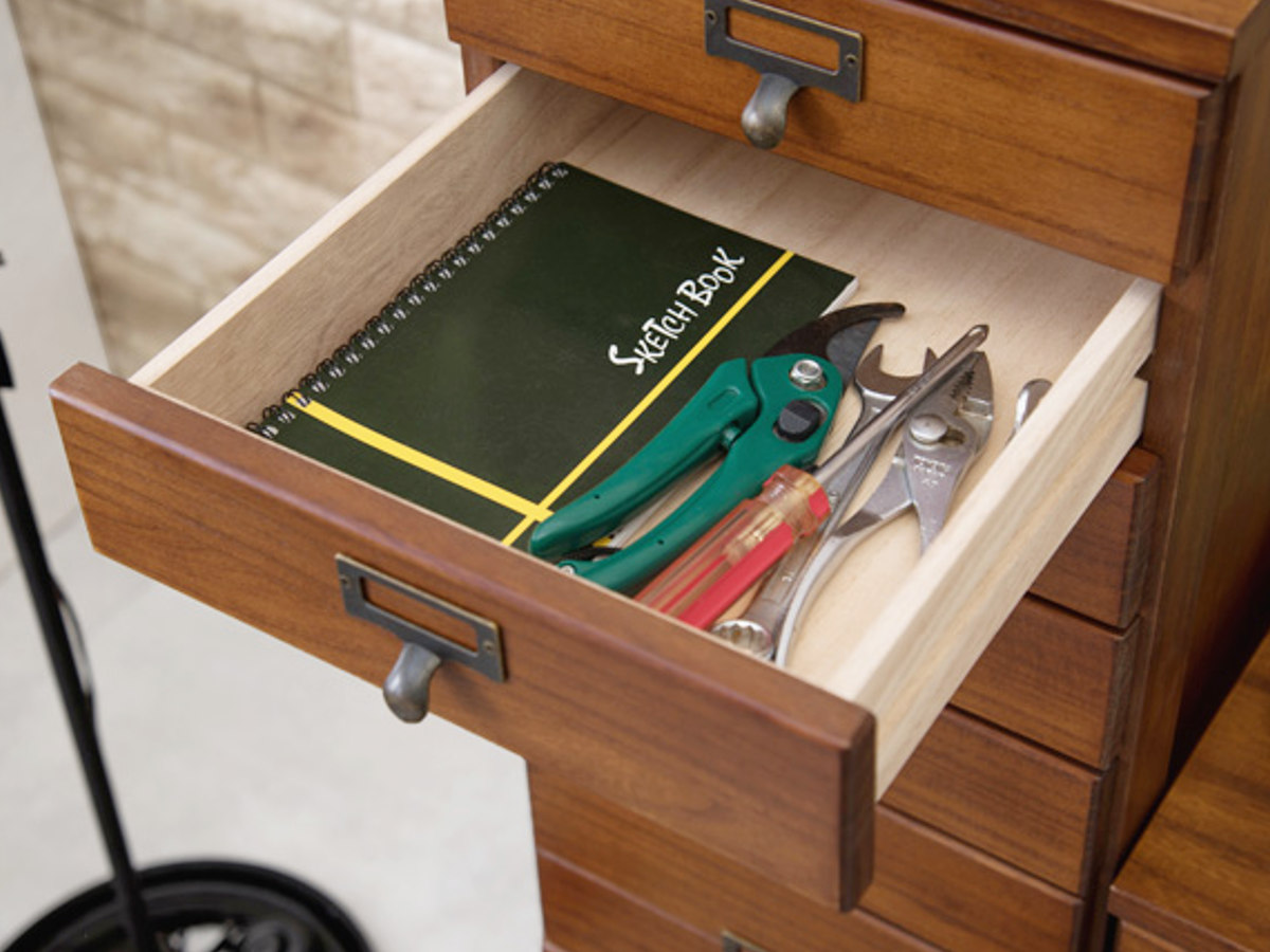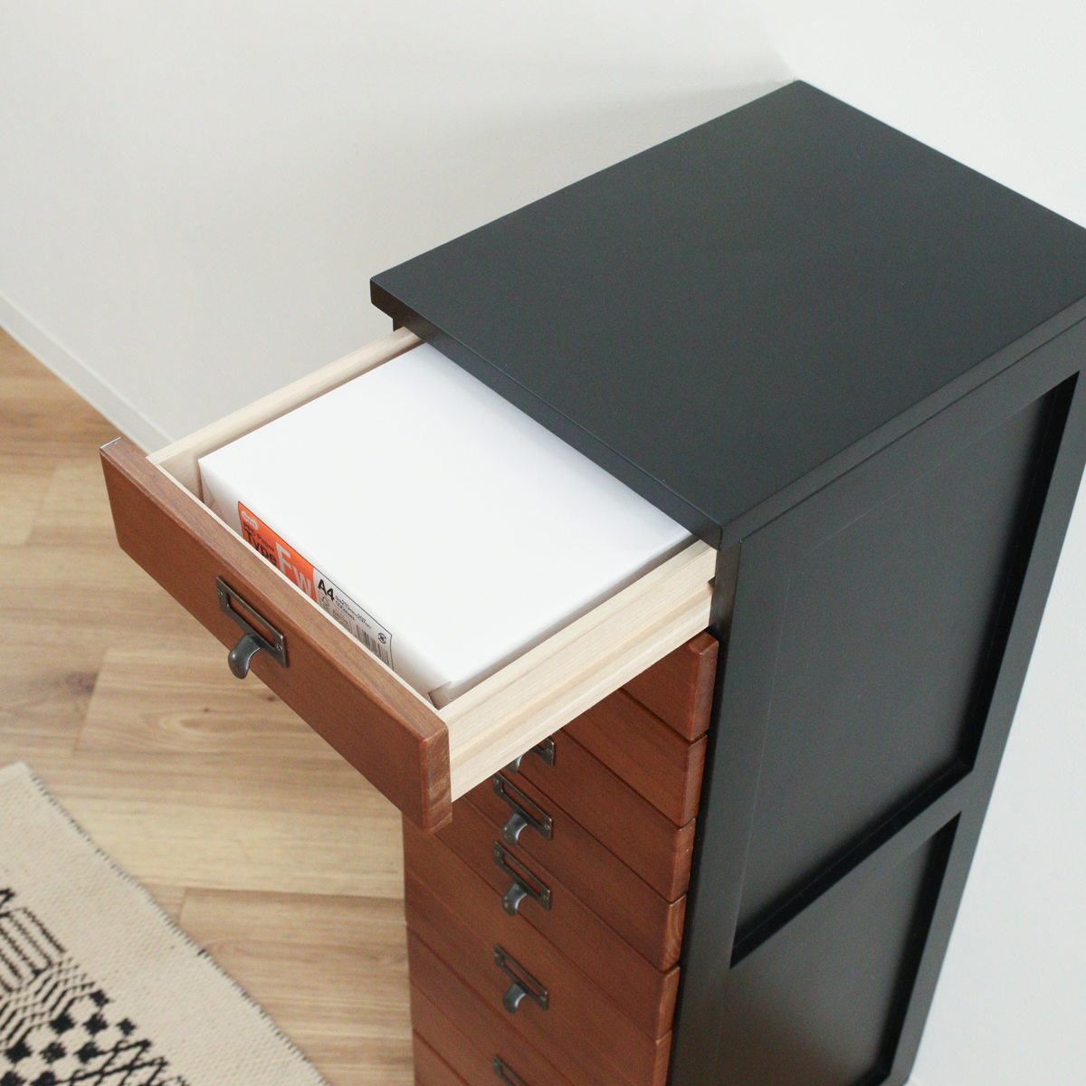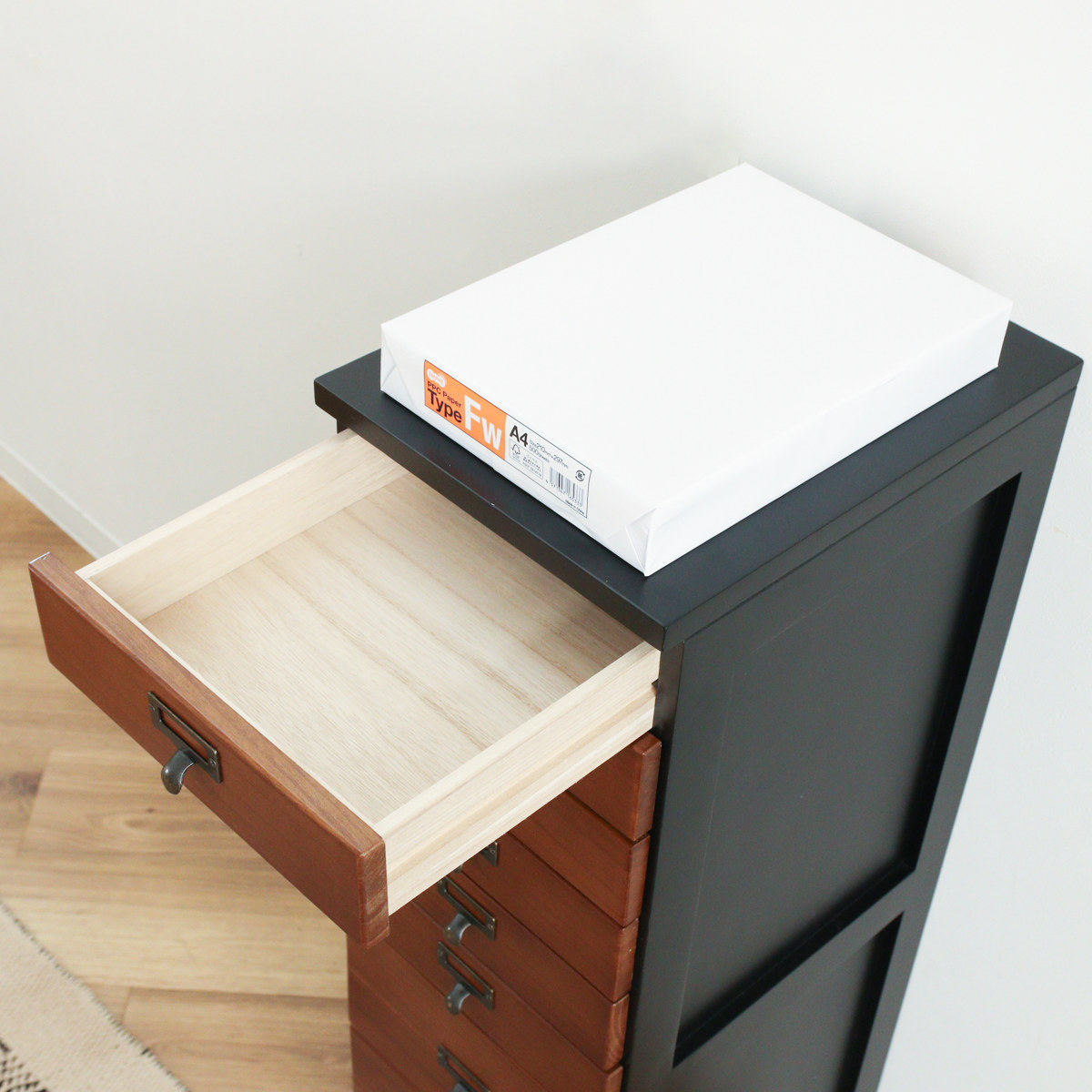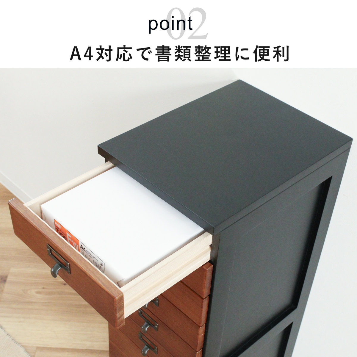 引出しはA4サイズのクリアファイルが収まるサイズです。書類や郵便物、プリント類を段ごとに分けて収納でき、必要なものをすぐに取り出せます。