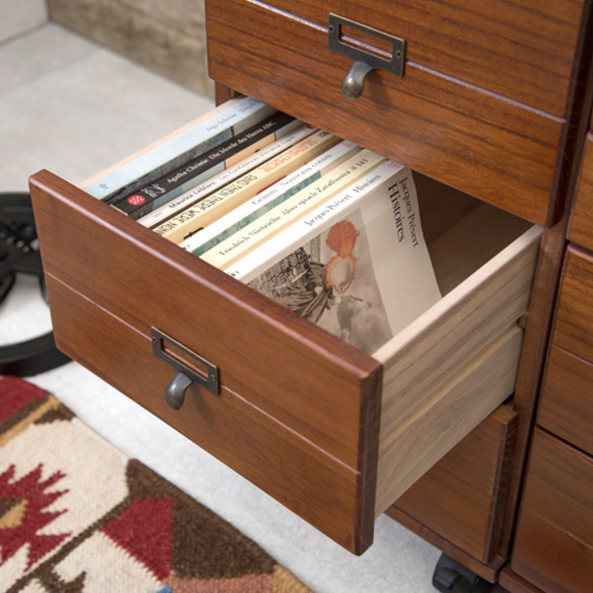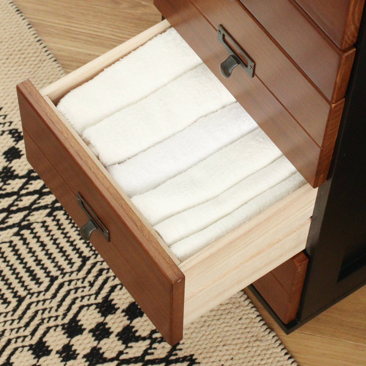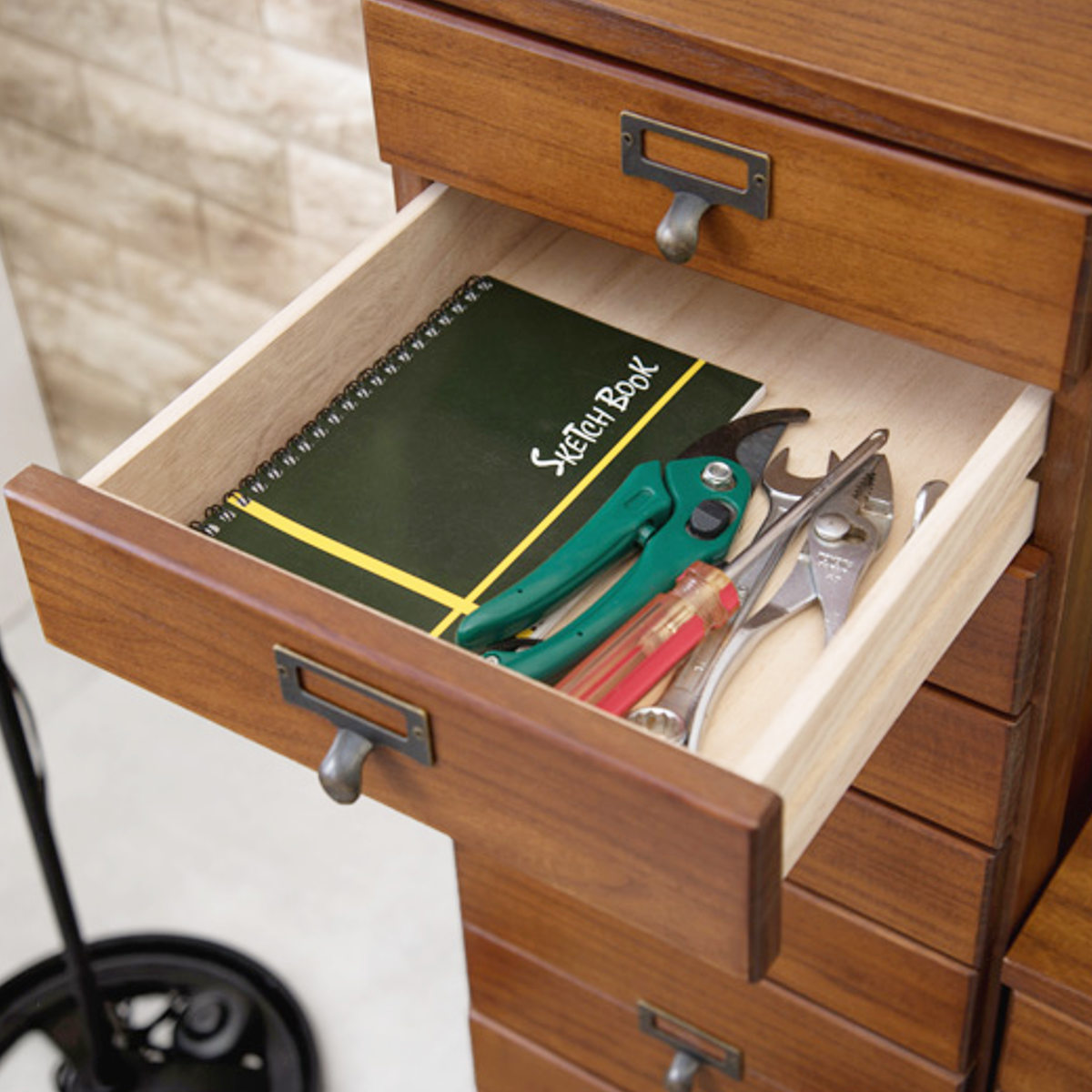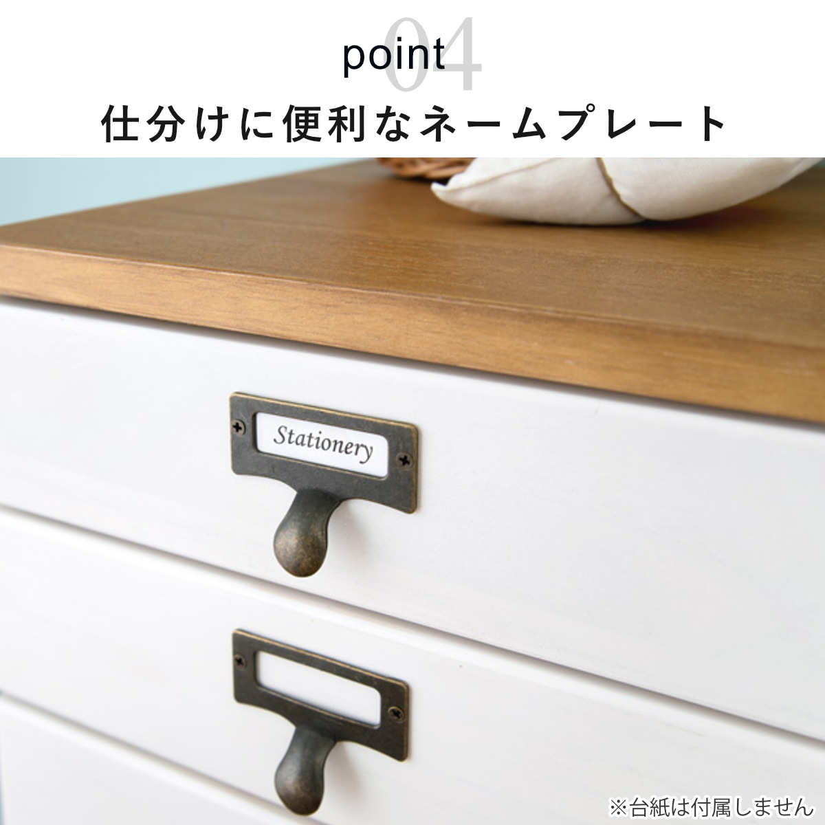 どこに何を収納しているかが分かりやすい、ネームプレート付きの取っ手。つまみやすく、アンティーク風のデザインがチェスト全体のアクセントになります。