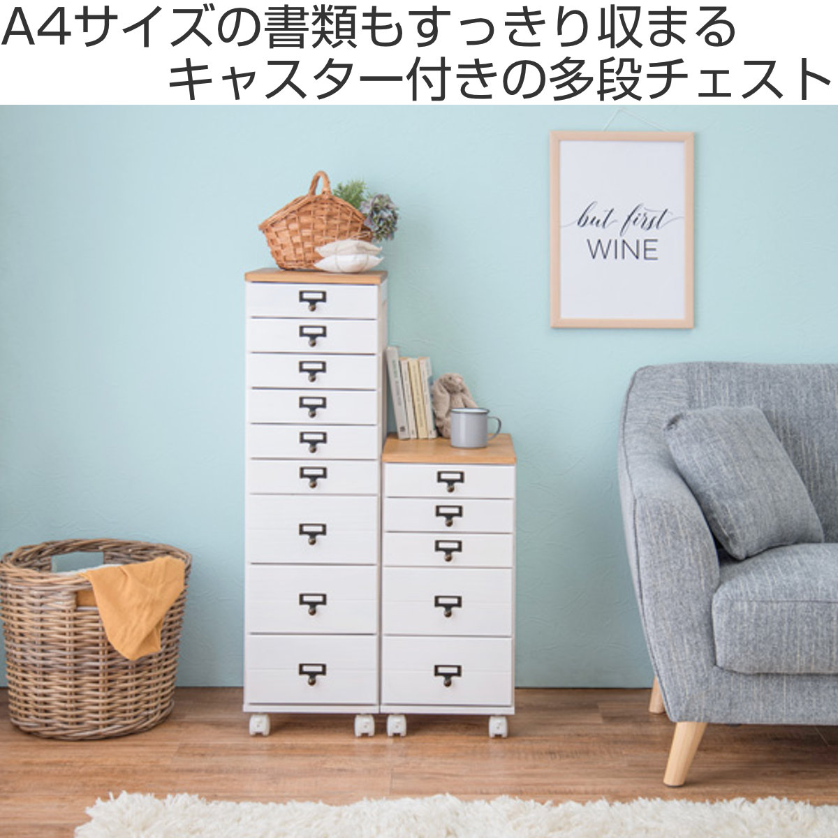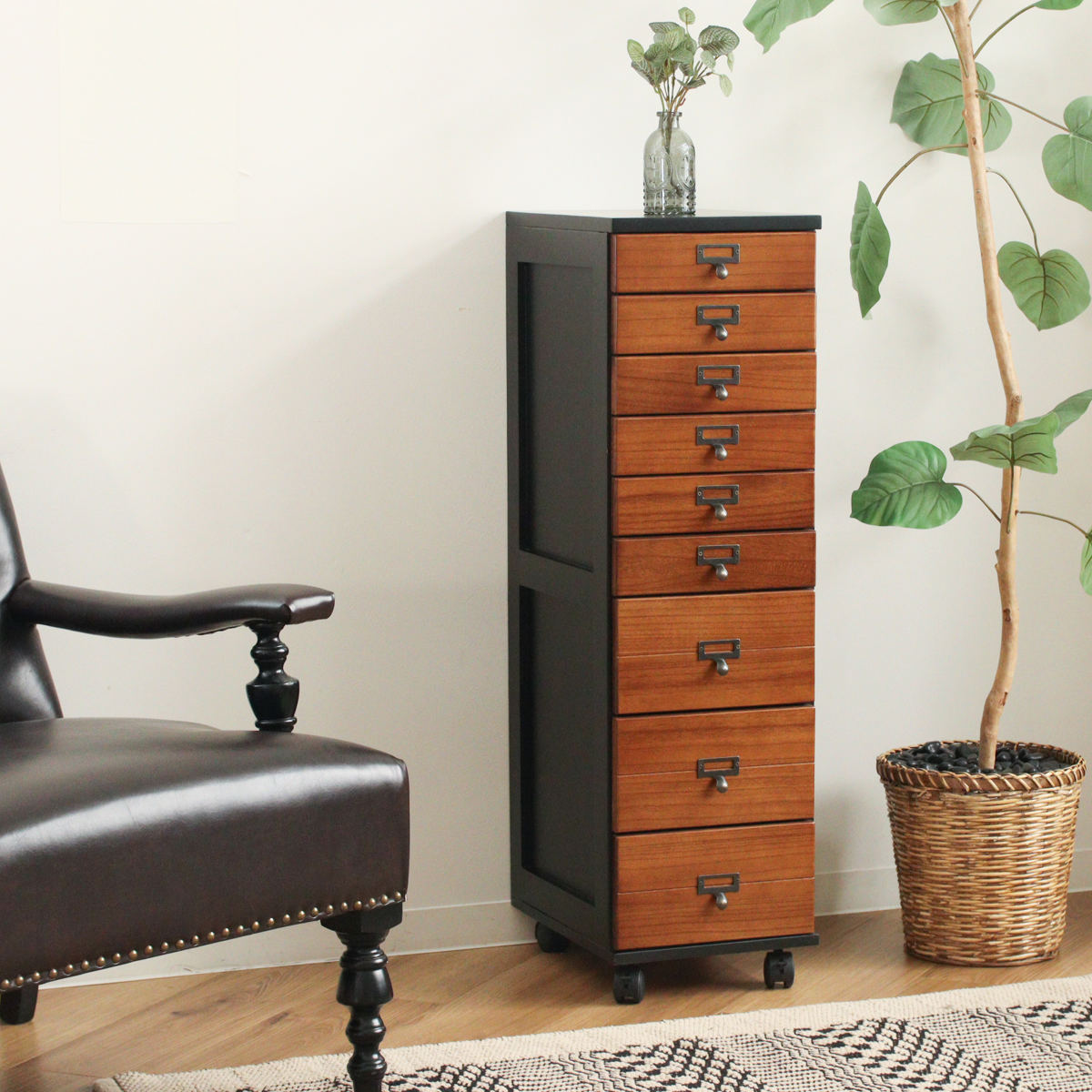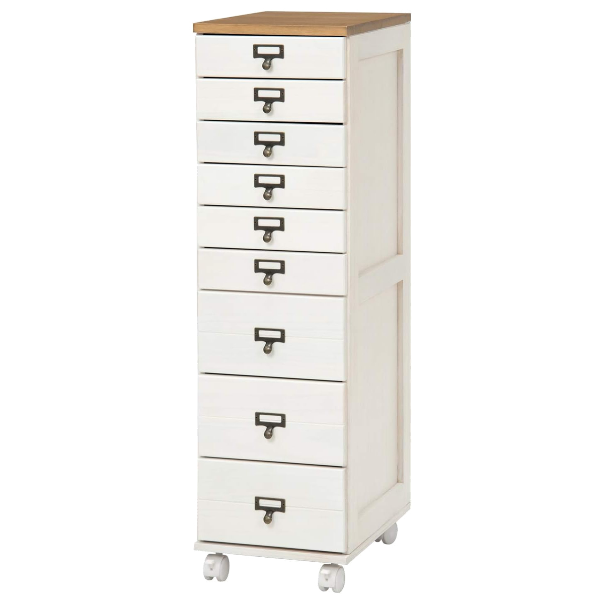 幅28cmのスリム設計で、リビングや書斎、廊下などの限られたスペースにも設置しやすいチェストです。9段構造で収納力があり、移動に便利なキャスター付きです。キャスターを取り付けるだけの完成品で、届いたその日からすぐにお使いいただけます。