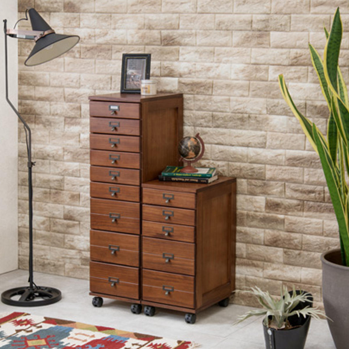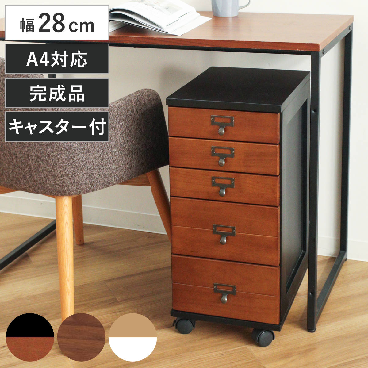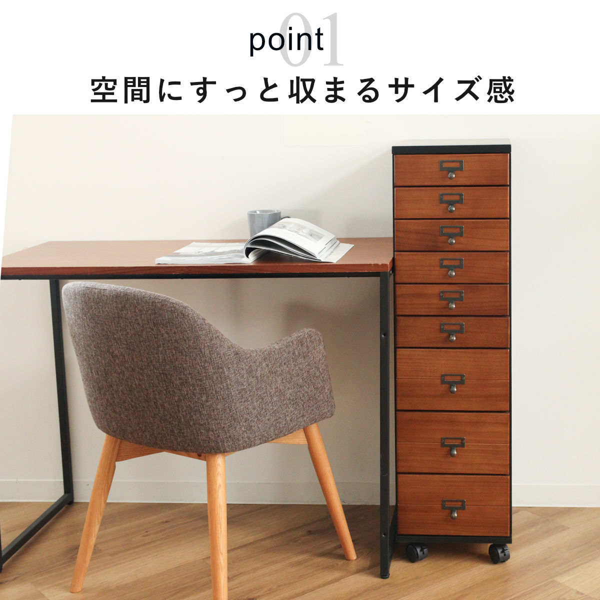 幅28cmのスリム設計で、リビングや書斎、廊下などの限られたスペースにも設置しやすいチェストです。9段構造で収納力があり、移動に便利なキャスター付きです。キャスターを取り付けるだけの完成品で、届いたその日からすぐにお使いいただけます。