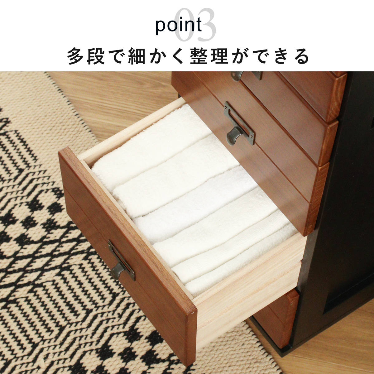 | 注意事項 | ※天然木を使用しているため、1点1点色合いや風合いが異なります ※引出しにスライドレール・ストッパーは付いておりません ※商品ページ内には別の商品を含む画像を使用しています |