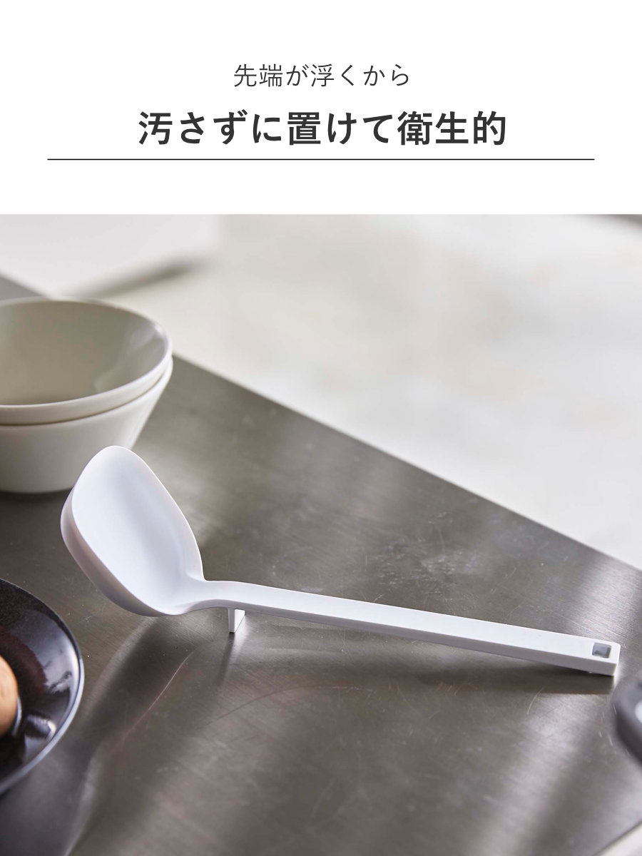 先端が浮くので直置きにならず清潔に使えます。サッと置けて使う時もすぐに取れるので、お料理中のストレスも少ないです。調理台を汚さずに置けるのが嬉しいポイント。