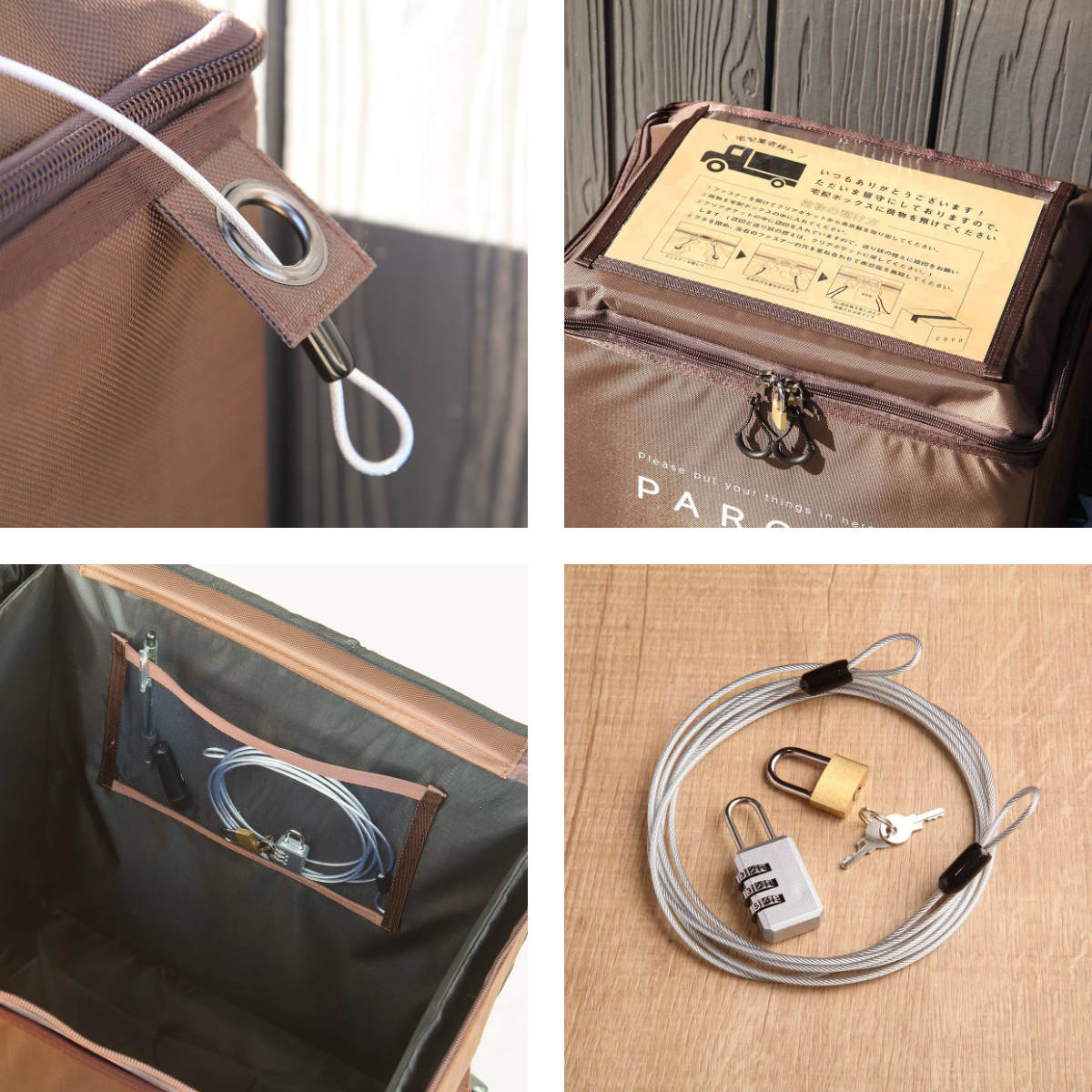 ボックス側面にあるハトメ付きの穴からワイヤーをくぐらせて、ドアノブや柱などに固定できます。ダイヤル錠で施錠することで防犯面も安心です。