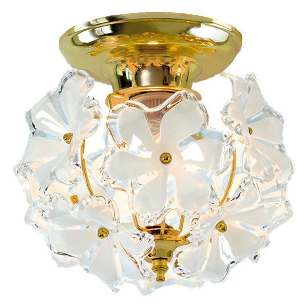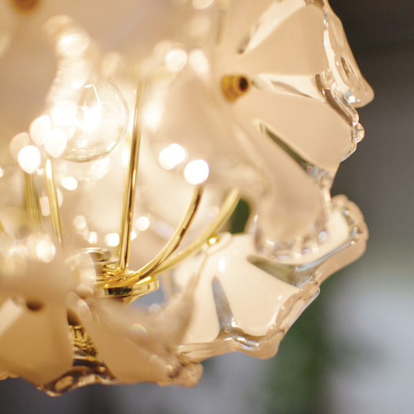 乳白色の花びらと透明な縁取りからこぼれる柔らかな光が印象的です。点灯するとゴールドの金具がキラキラ輝き、ムードある空間を演出します。