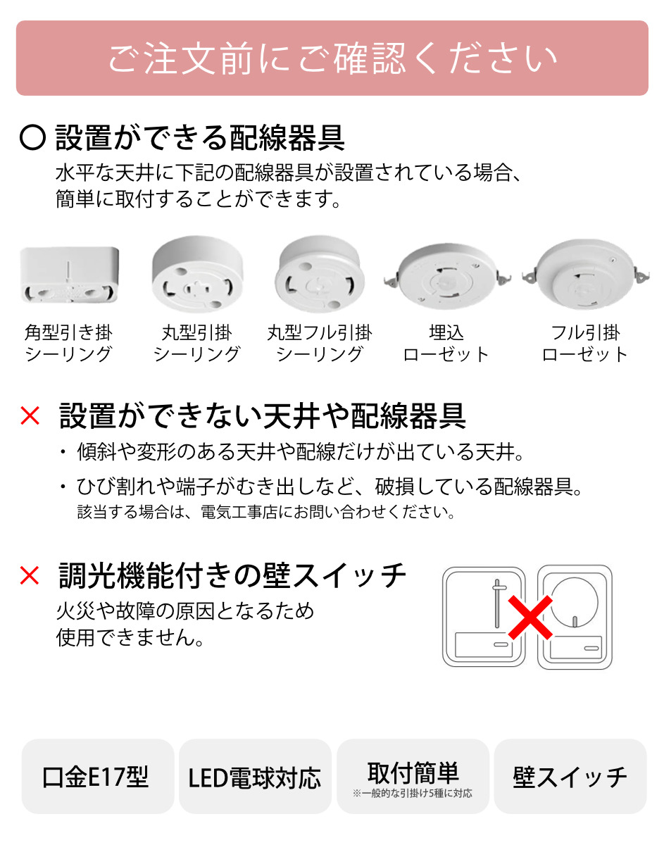 | 備考 | 使用電球:E17 40W クリアミニ球×1 白熱電球・LED電球対応(調光機能をご利用の場合は調光専用のLED電球をご使用ください) |