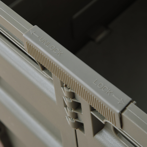 底板を上げて、サイドのロックを解除します。本体を折りたたみ、サイドをとめれば、コンパクトにできます。持ち手付きで、持ち運びに便利です。