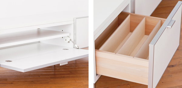 引出しには、仕切りが付いているので、収納物が取り出しやすく、整理整頓に便利です。スライドレールが付いているので、スムーズに開閉できます。