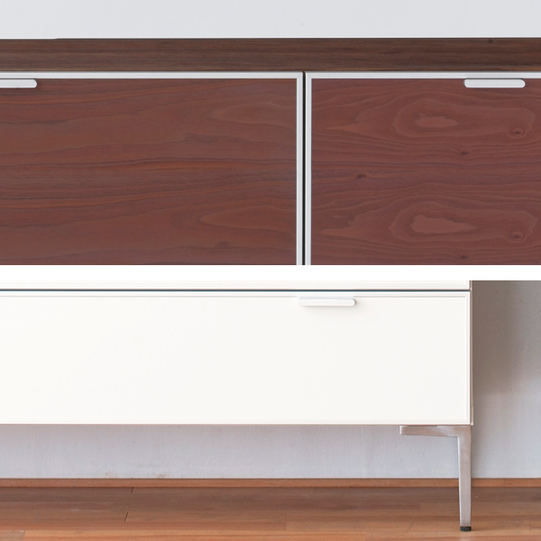金属でありながら柔らかい質感を持つアルミ材と、木材を組み合わせたチェストです。金属製のスリムなオリジナルの脚部が魅力で、現代的な素材を生かしたミニマムなデザインです。