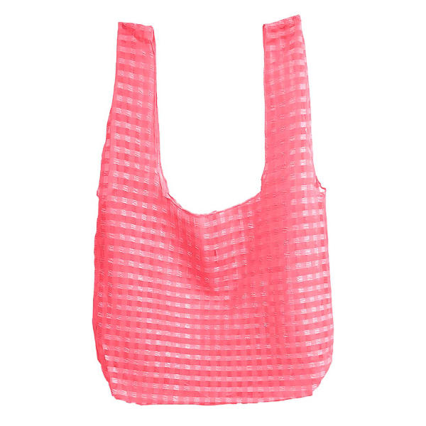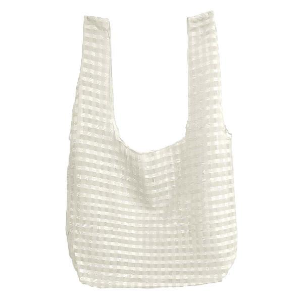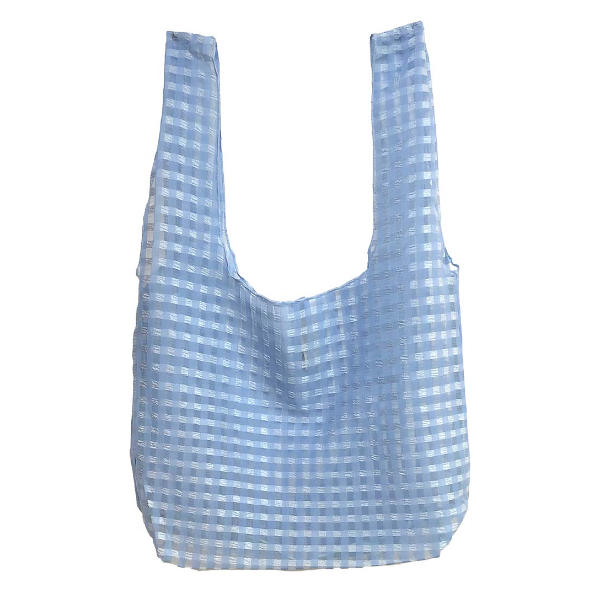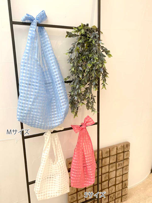 ふわっと軽いギンガムチェック柄で、肩掛けにも手提げにもなるちょっと透けた感じの素材がお洒落なエコバッグです。ショルダーにすれば、手がふさがらずお出かけやお買い物を楽しめます。また、持ち手部分をリボン結びすれば、手提げになります。