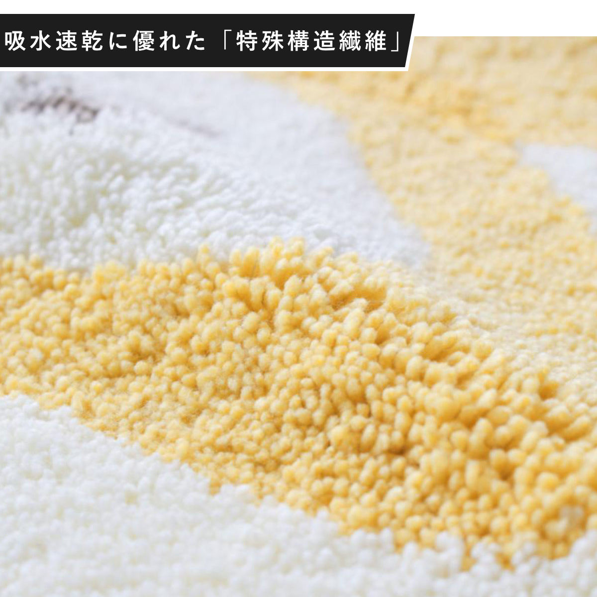 無数の細かな穴が設けられた「特殊構造繊維」を使用しています。この穴が水分を素早くたっぷり吸い取って直ちに拡散するため、マットの表面はいつもサラッと快適な使い心地が続きます。