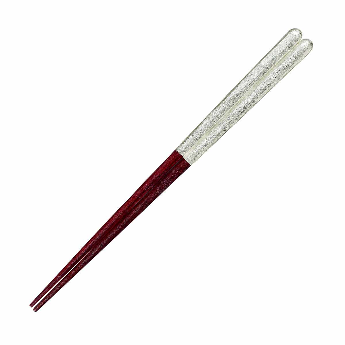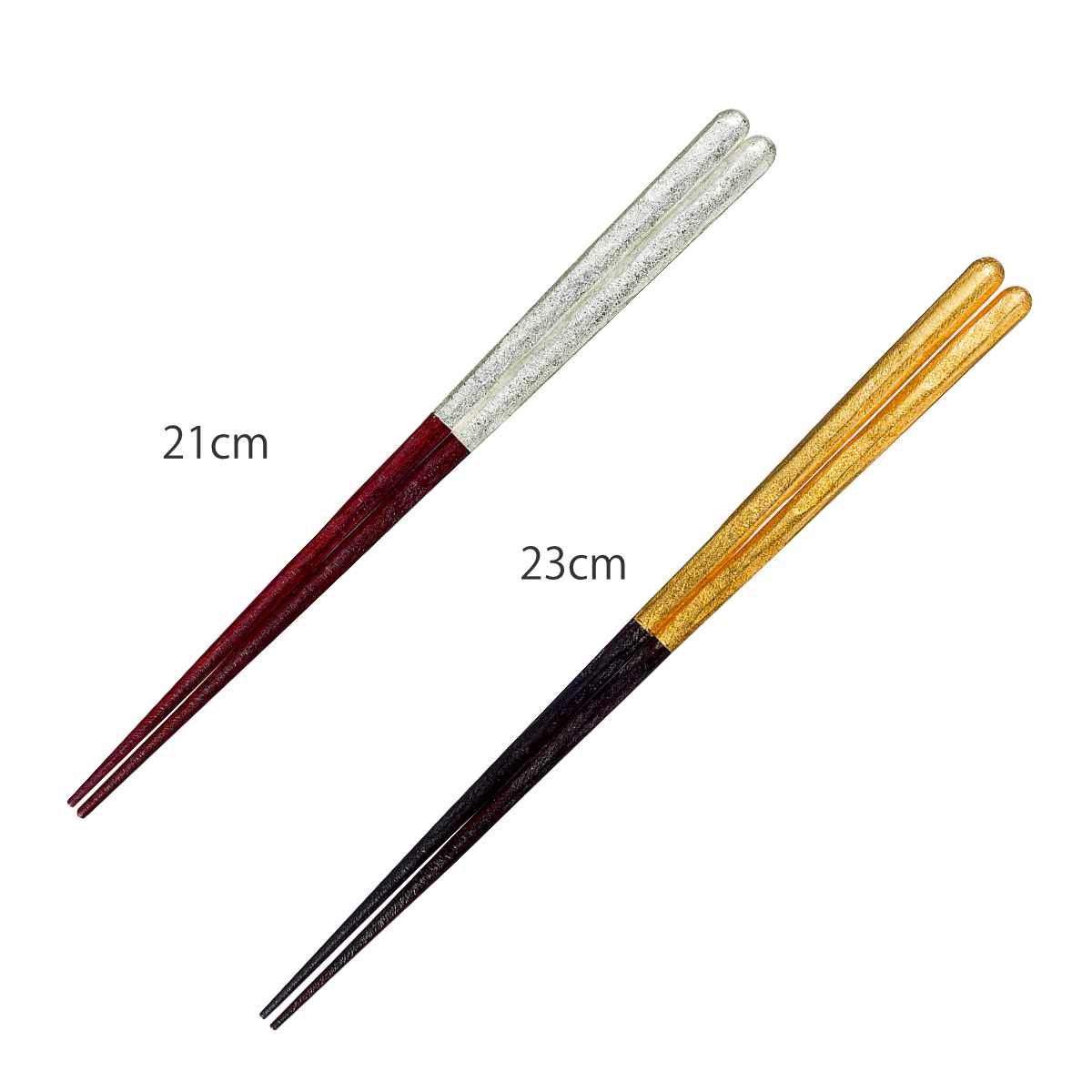 金沢純銀箔を贅沢に施した上質なお箸です。正月や結婚など祝いの席で使うと、食卓をひと際華やかに彩ってくれます。色違いのお箸で揃えると、夫婦箸になります。