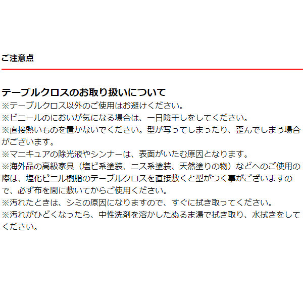 ※海外品の高級家具(塩ビ系塗装、ニス系塗装、天然塗りの物)などへのご使用の際は、塩化ビニル樹脂のテーブルクロスを直接敷くと型がつく事がございますので、必ず布を間に敷いてからご使用ください。