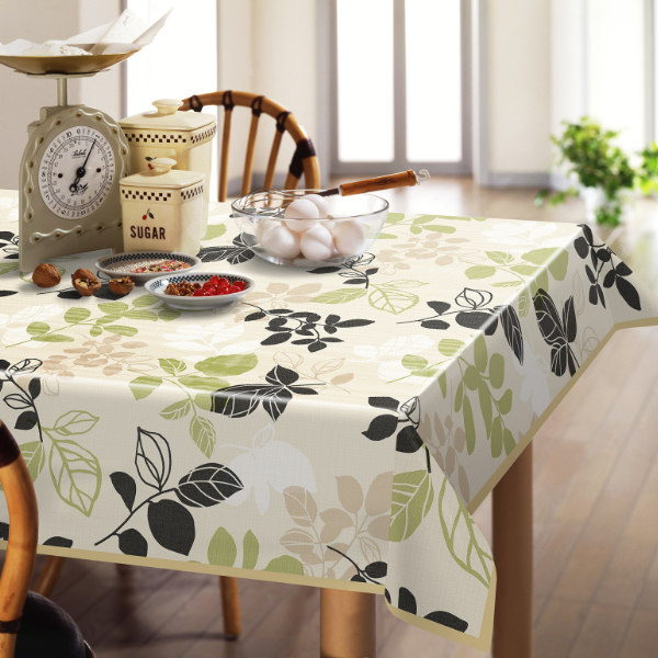 落ち着いた色合いと大きな植物の模様が華やかなテーブルクロス