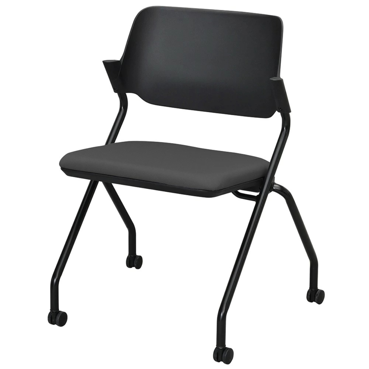 座面は跳ね上げ式で、平行にスタッキングが可能なミーティングチェアです。スタッキング時の奥行きは、1脚重ねるごとに約12cm増えます。収納スペースに合わせて、何脚でも重ねて収納できます。また、折りたたんだ状態でも安定感があり、倒れにくい設計です。