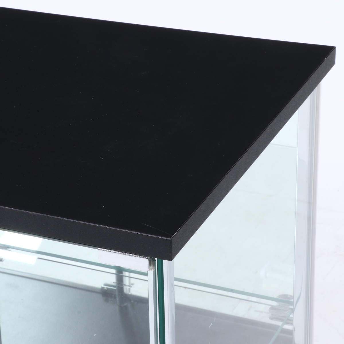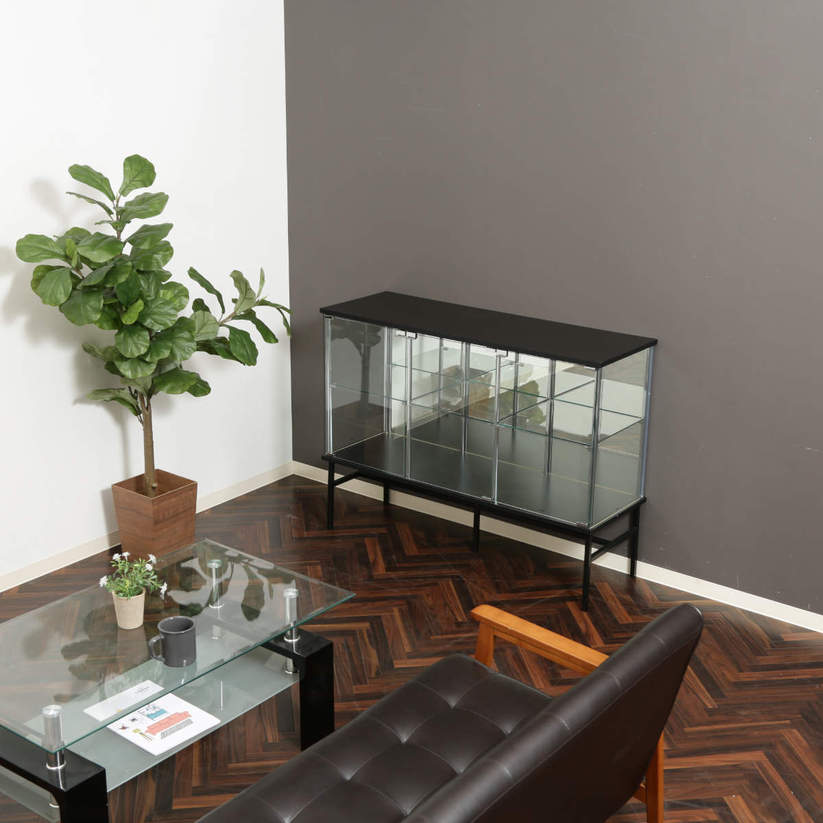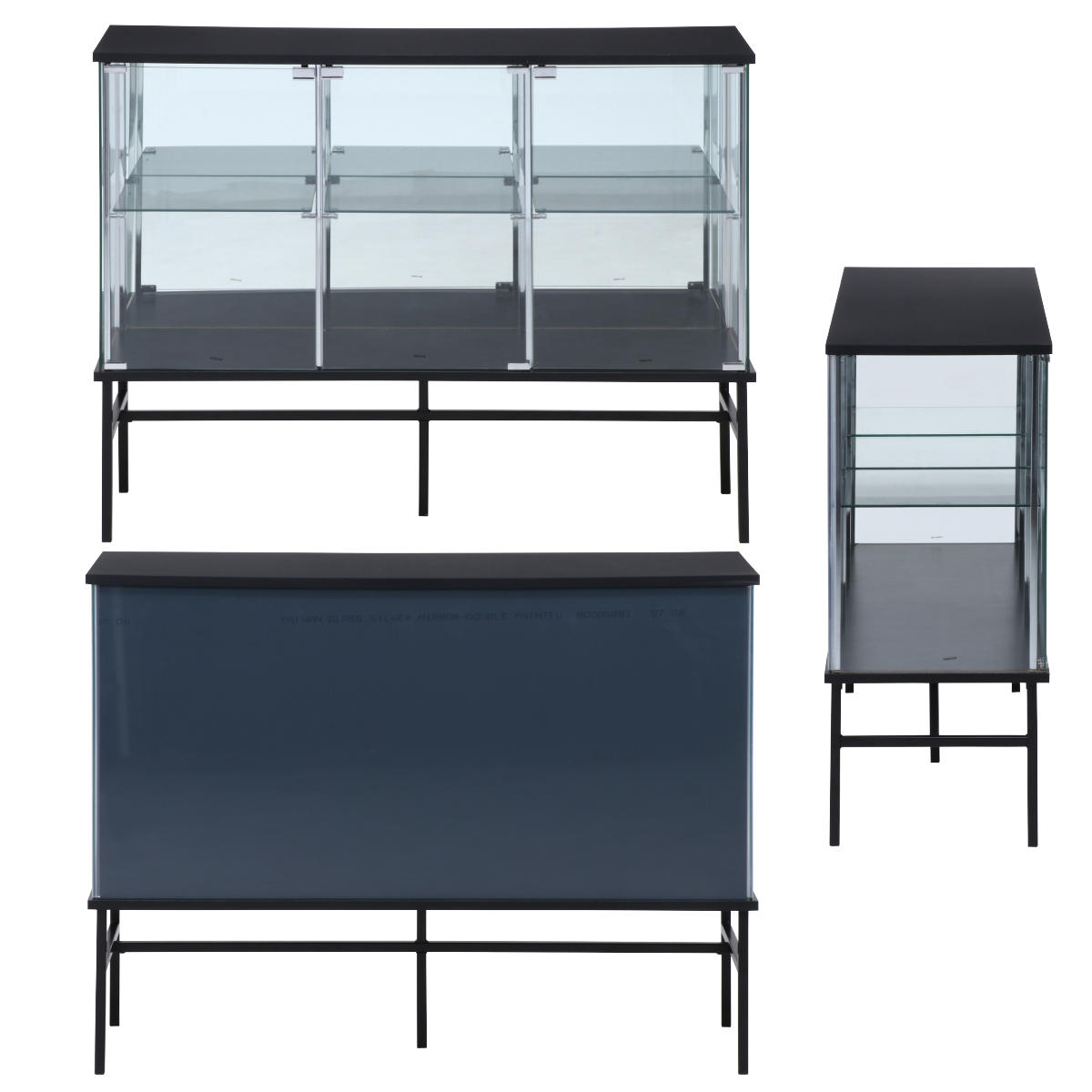 | 材質 | 天板/地板:プリント紙化粧繊維板 脚部:金属(鋼)、エポキシ樹脂塗装 扉板/背板/側板/棚板:強化ガラス 柱:めっき(クロム)、金属(鋼) |
