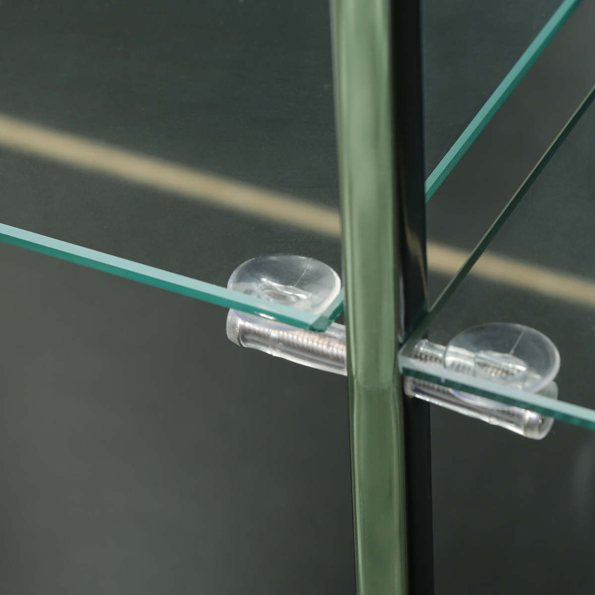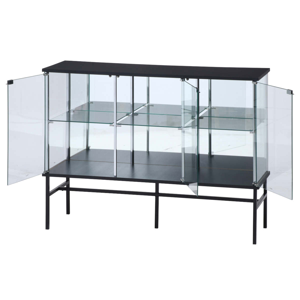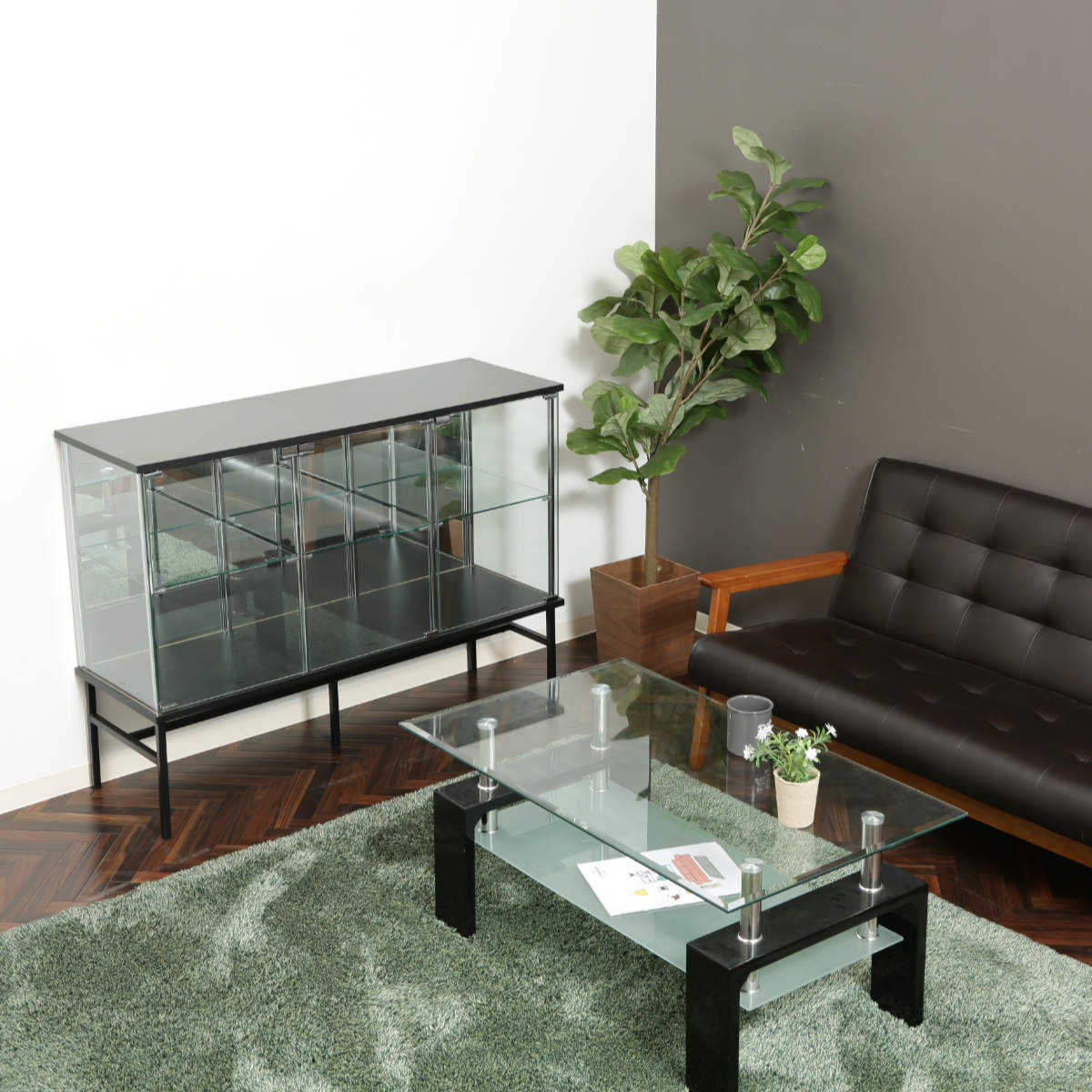| 材質 | 天板/地板:プリント紙化粧繊維板 脚部:金属(鋼)、エポキシ樹脂塗装 扉板/背板/側板/棚板:強化ガラス 柱:めっき(クロム)、金属(鋼) |