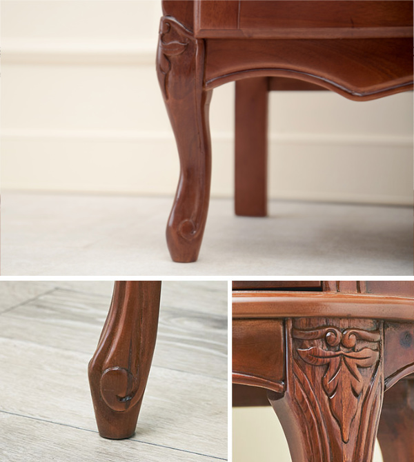 脚部は、エレガントで柔らかな曲線を描いた猫脚仕様です。脚先に至るまで惜しみなく彫刻を施しています。