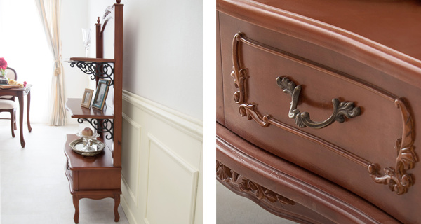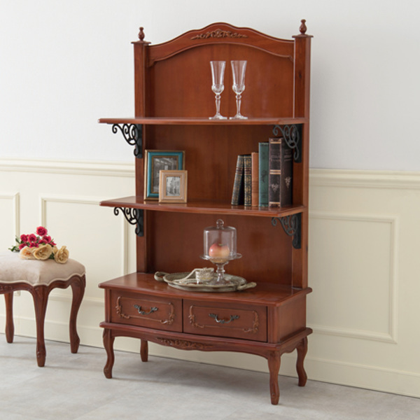 細部のデザインにこだわった、アンティーク調の上品なラックです。深みのある色合いと優雅なシルエットが、華やかで格調高い空間を演出します。お気に入りの小物や食器をディスプレイして優雅な空間をお楽しみいただけます。