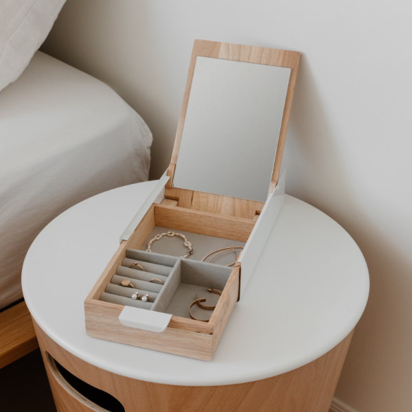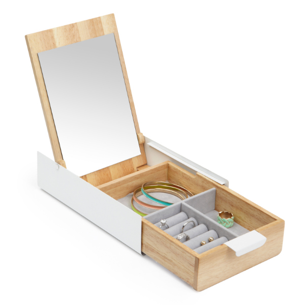 取っ手を引くと本体が開いてミラーが出てくる、ユニークなジュエリー収納です。リングやピアス、ブレスレットなど毎日使う小物収納に最適です。ジュエリーボックスに鏡が付いていることで、ピアスやネックレスなど鏡を見ながらつけたいアクセサリー類もその場でサッと身につけることができます。