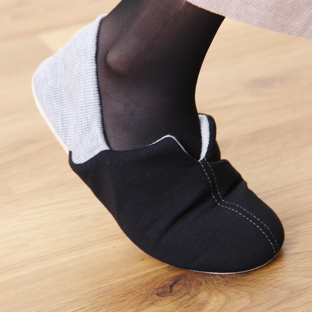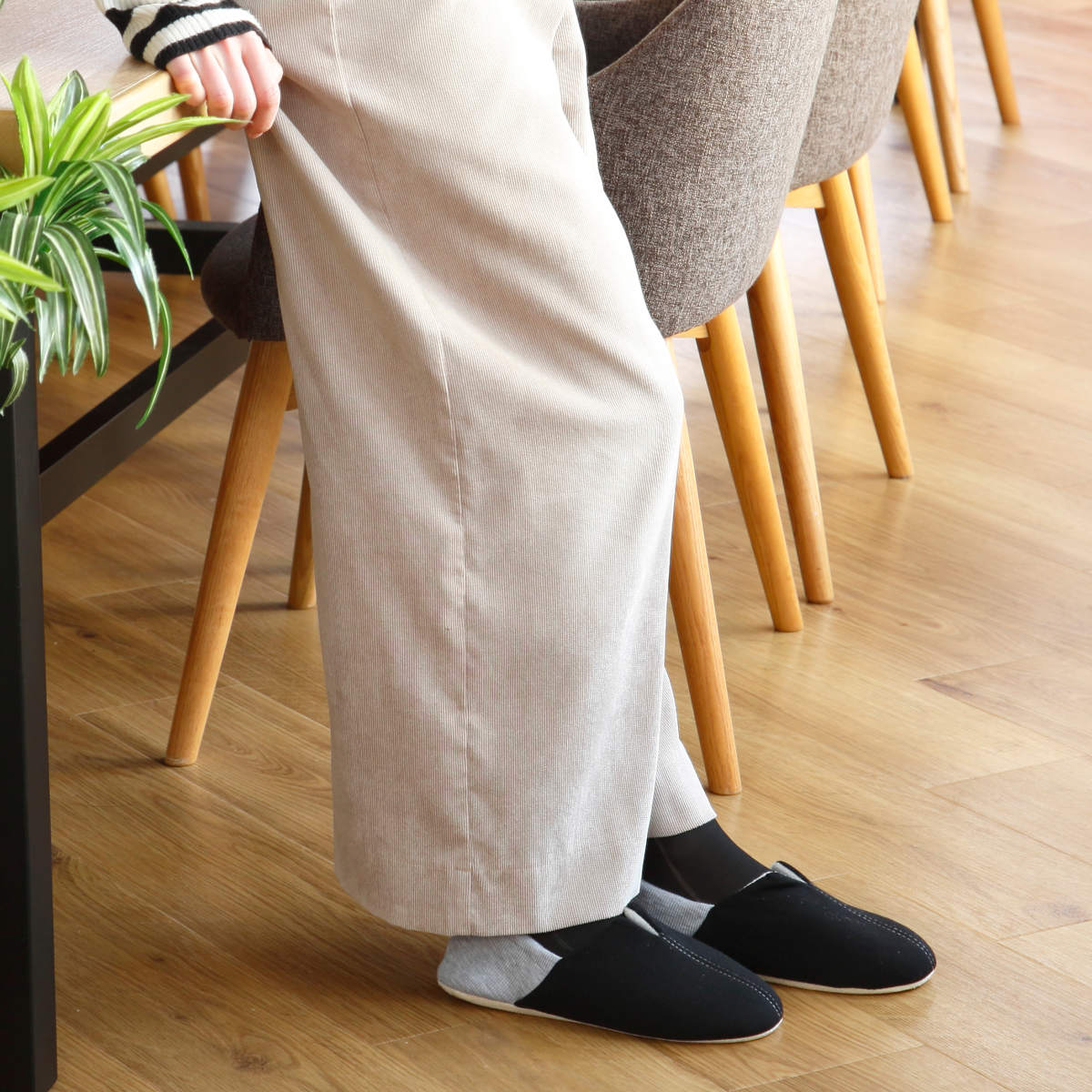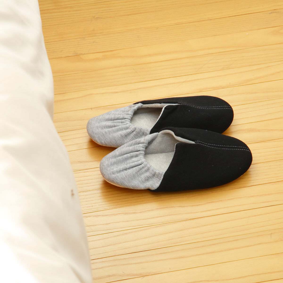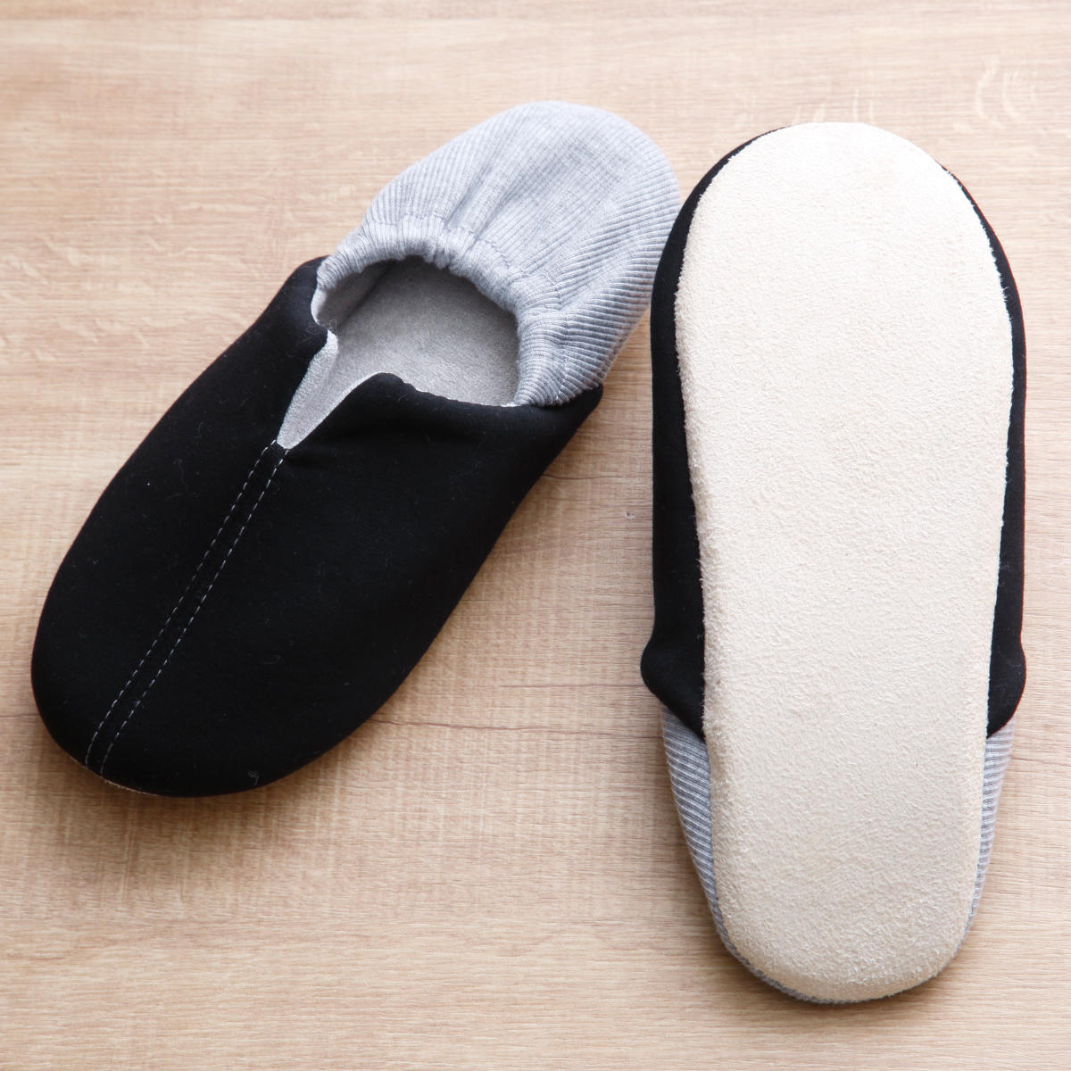 底面には滑りにくい生地を使用しています。フローリングなどの床材に優しく、パタパタ音が鳴りにくいので、日常使いに適しています。