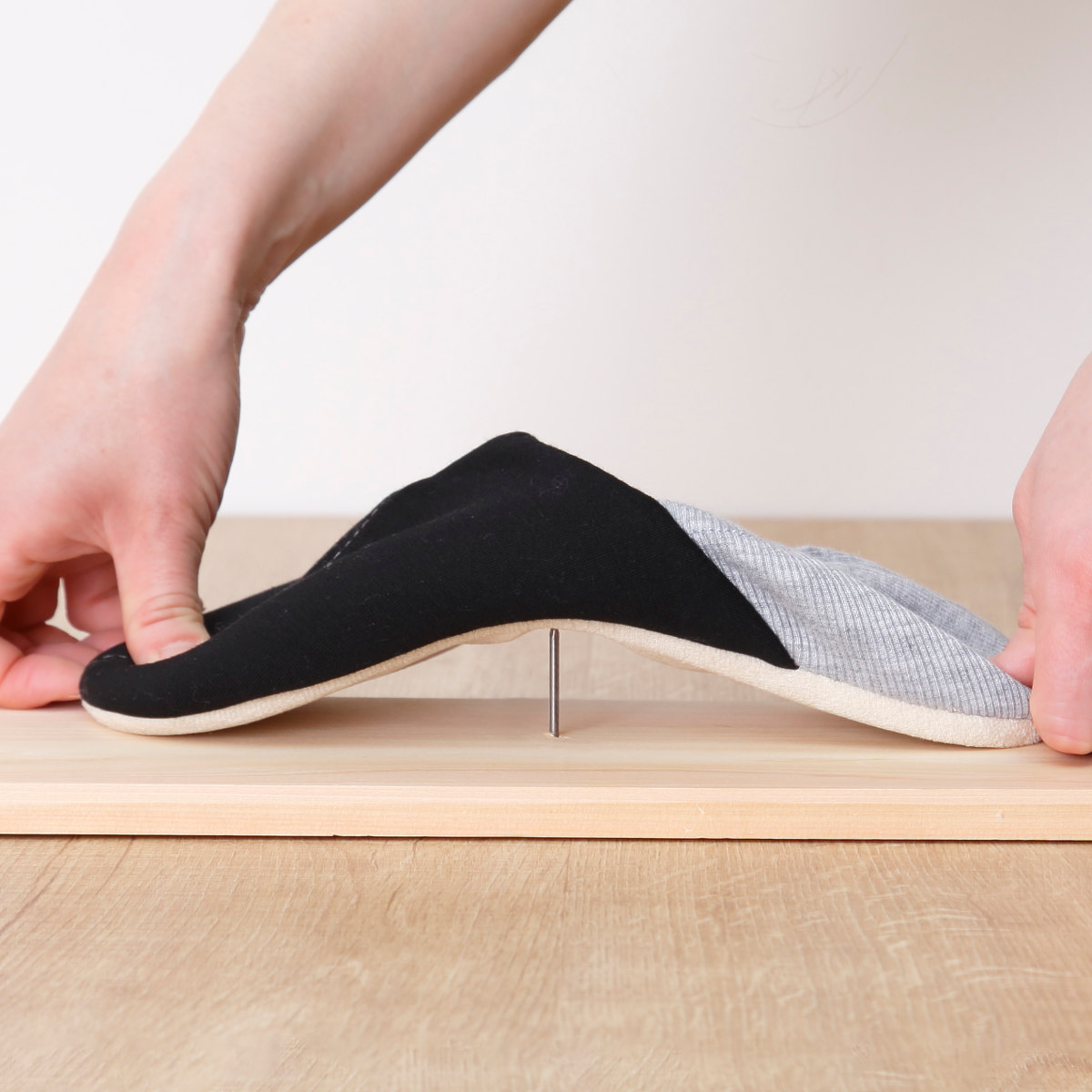 かかと部分は伸縮性があり折りたたんで履けるので、脱ぎ履きがしやすく日常使いに便利です。災害時には、かかとのゴムをサッと被せるだけで防災スリッパになります。