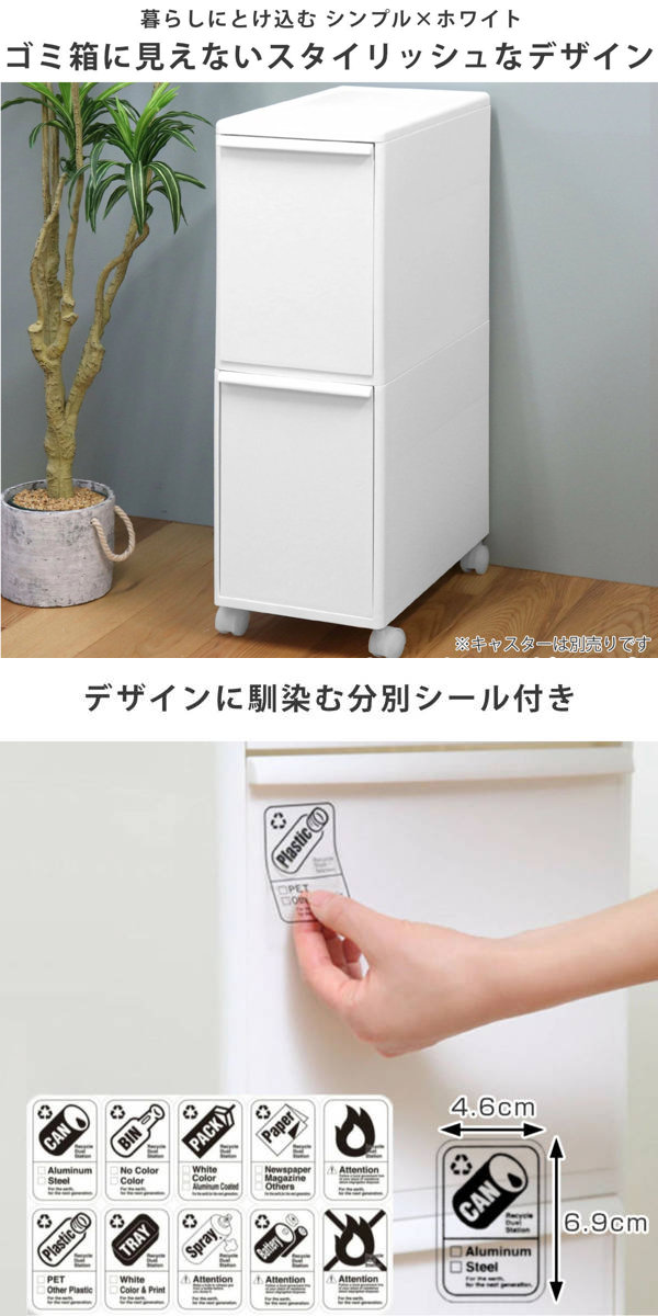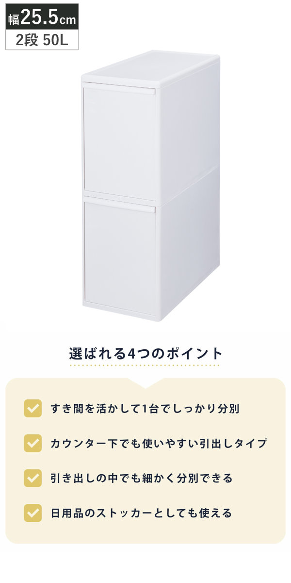 冷蔵庫や食器棚の横にあるちょっとした隙間にも収まる幅25.5cmのゴミ箱です。縦型のゴミ箱なので、キッチンのデッドスペースを有効活用して、1台でしっかり分別ができます。