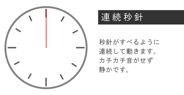 秒針がすべるようにして文字盤上をスムーズに動きます。カチカチ音がしないので、寝室など静かな場所でのご使用にもおすすめです。