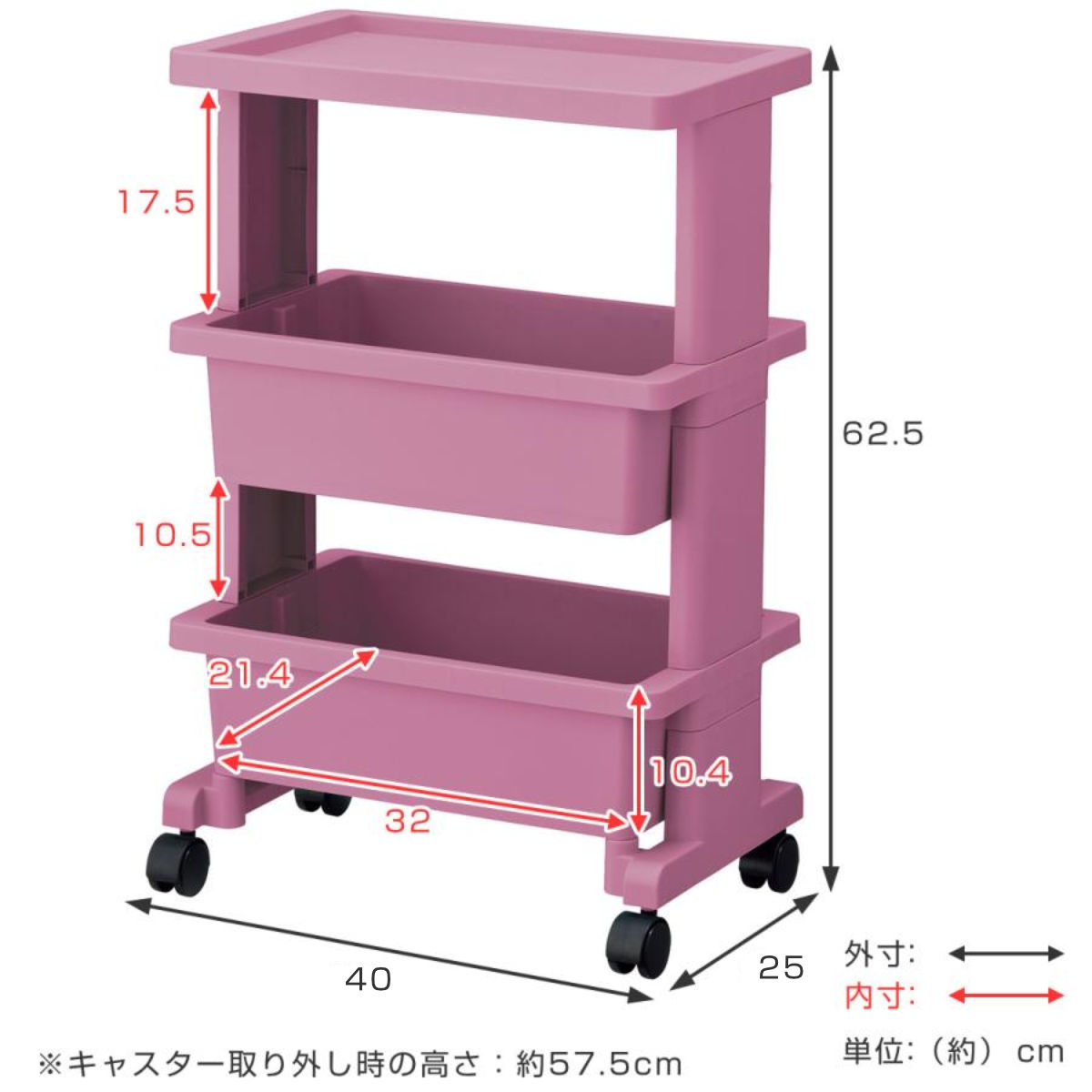 | サイズ | 約 幅40×奥行25×高さ62.5(cm) キャスター取り外し時の高さ:57.5cm 収納ワゴン:約 幅32×奥行21.4×高さ10.4(cm) |