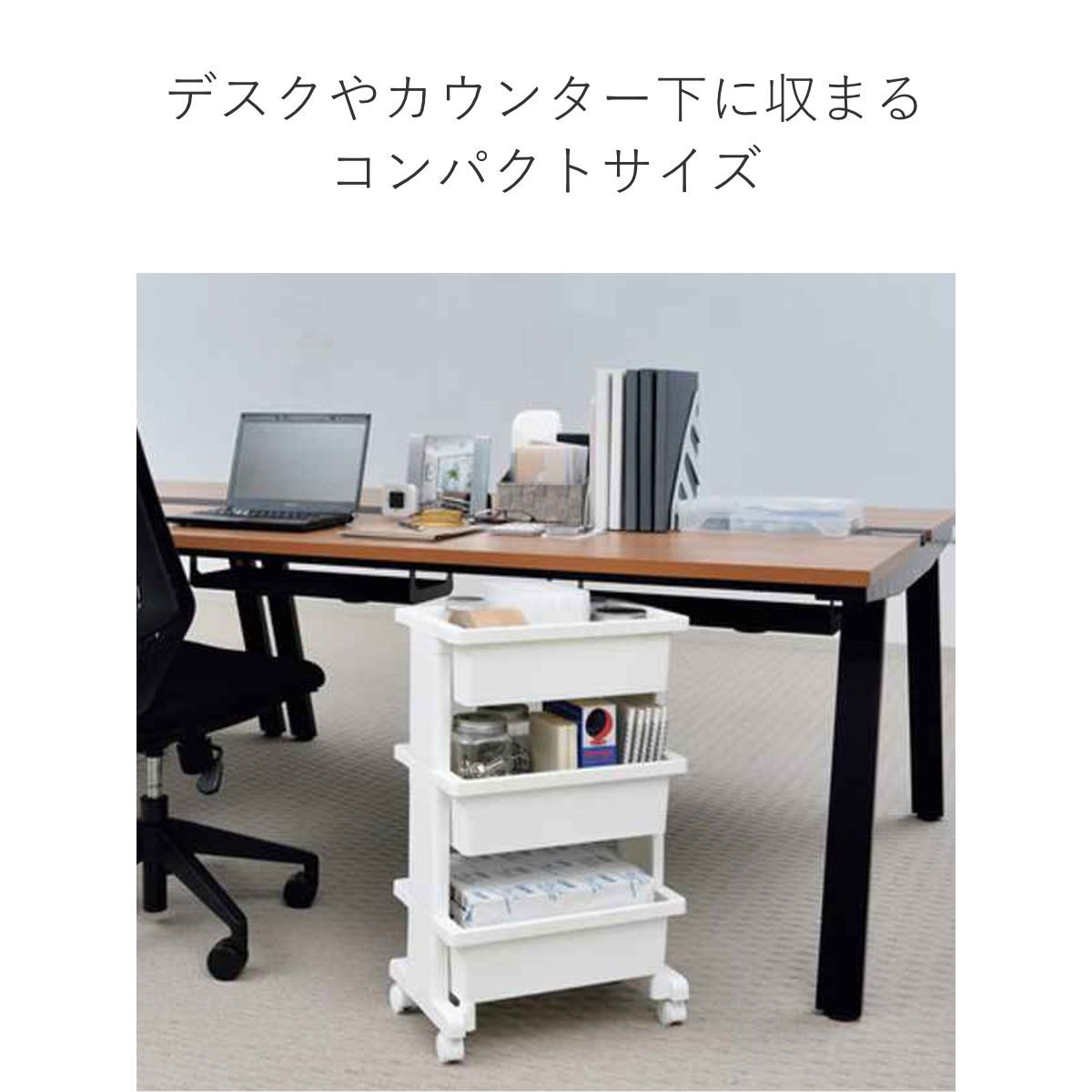 一般的なデスク(高さ約70cm)の下に収まるコンパクトサイズです。キッチンカウンターや食卓の下はもちろん、オフィスや書斎、子ども部屋のデスク下収納として使いやすいです。