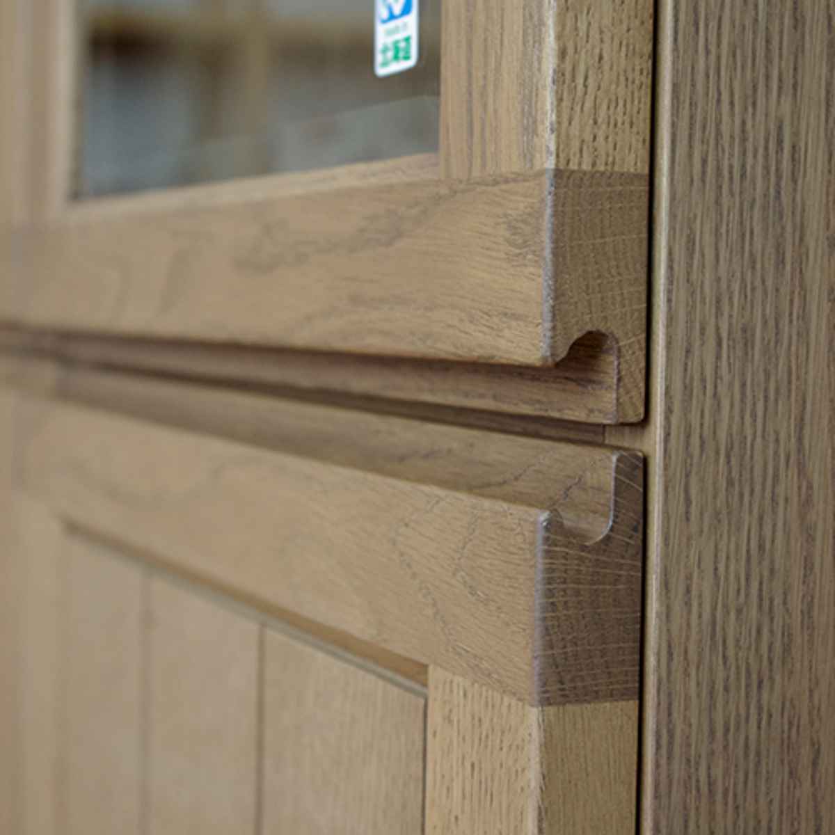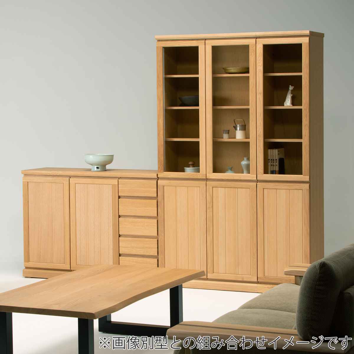 本棚や食器棚として、様々な用途でお使いいただけるフリーボードです。フロントがすっきりとしたシンプルなデザインで置き場所を選びません。艶の無いマットな総仕上げで天然木の質感を引き立てます。上下分割で開閉できる扉になっており、下は隠す、上は見せる収納として使い分けができます。
