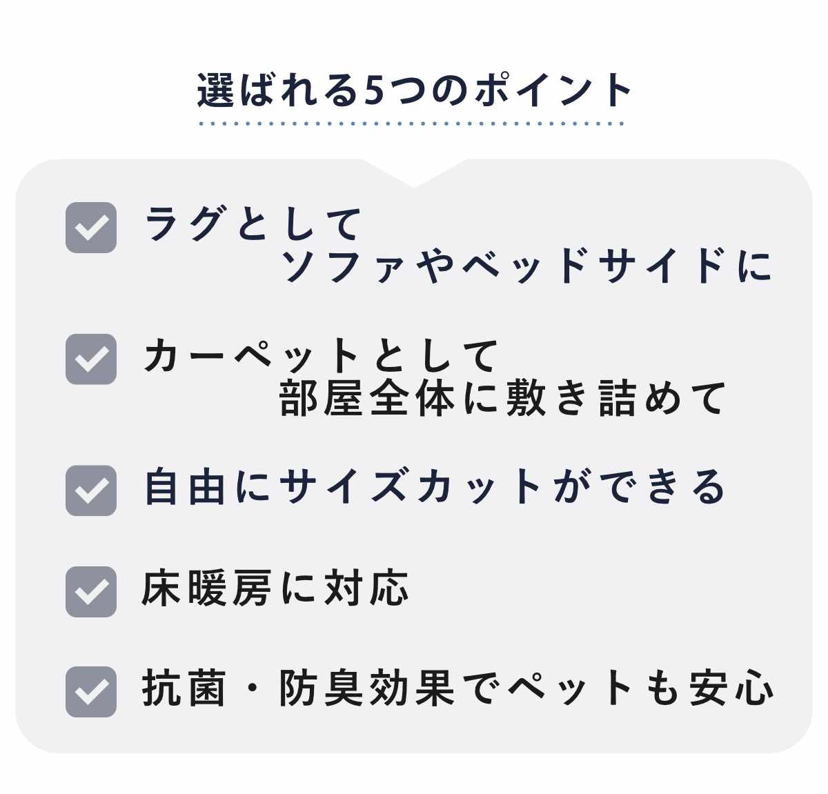抗菌効果で菌の増殖を抑制し、防臭効果も発揮するカーペットです。日本製の安心感と高機能を重ね備えました。お子様やペットと暮らすご家庭でも安心してお使い頂けます。