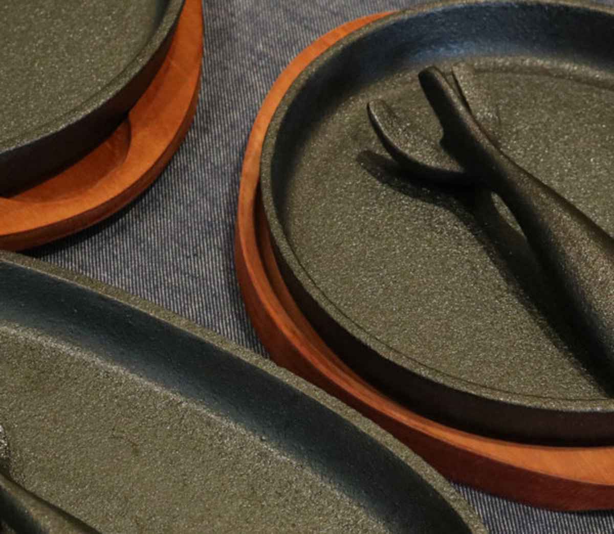 - ステーキ皿、ハンドル:鉄鋳物(焼付塗装) 木皿:天然木