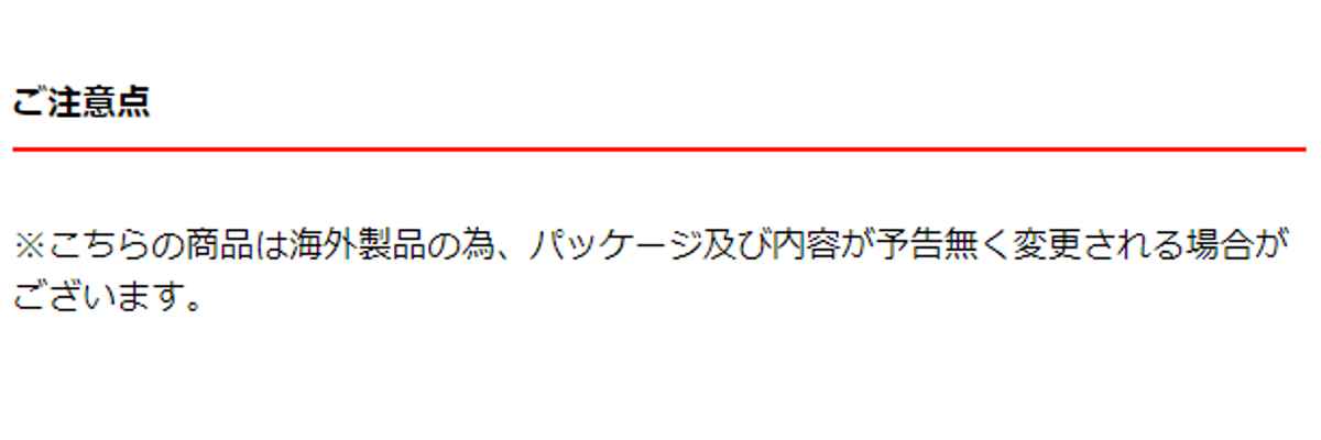 | 注意事項 | ※こちらの商品は海外製品の為、パッケージ及び内容が予告無く変更される場合がございます。 |