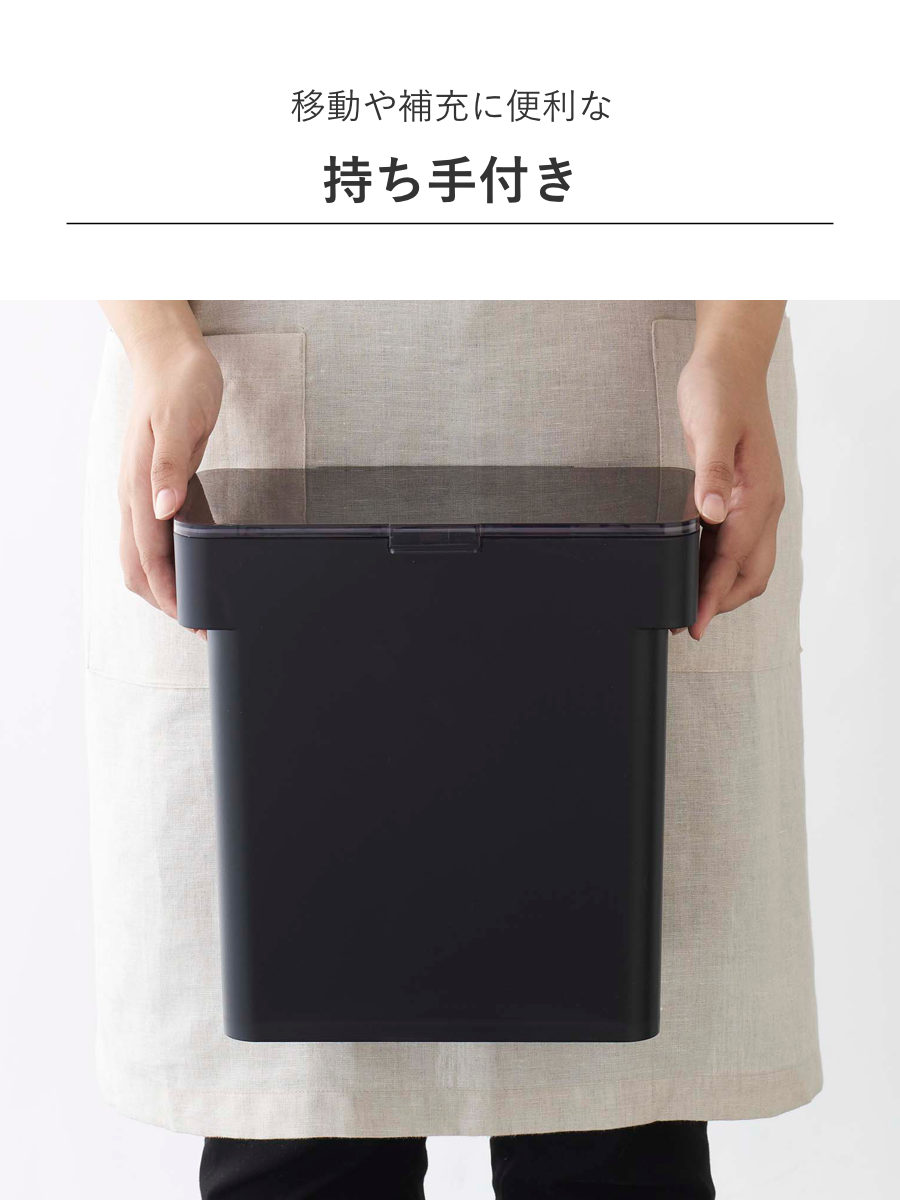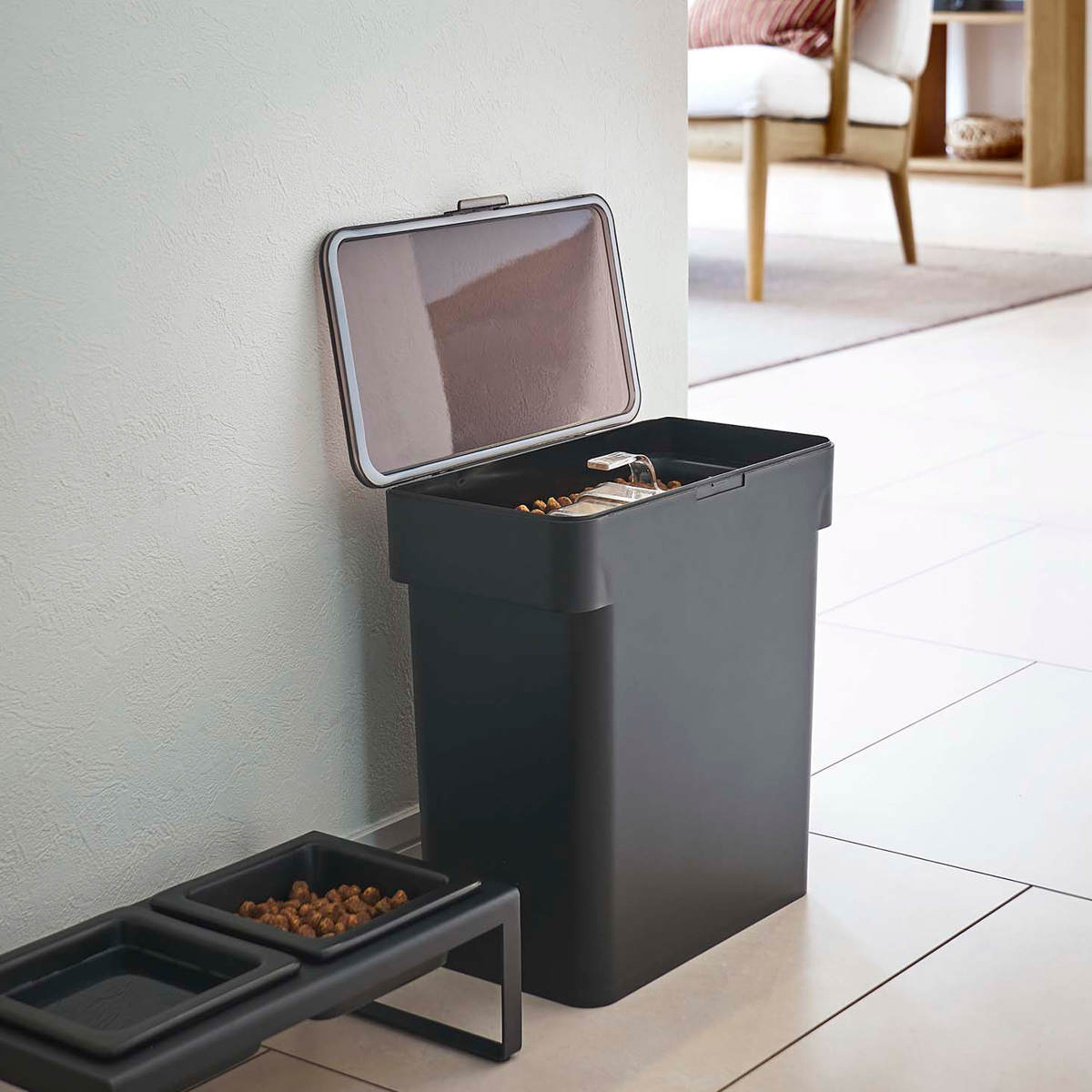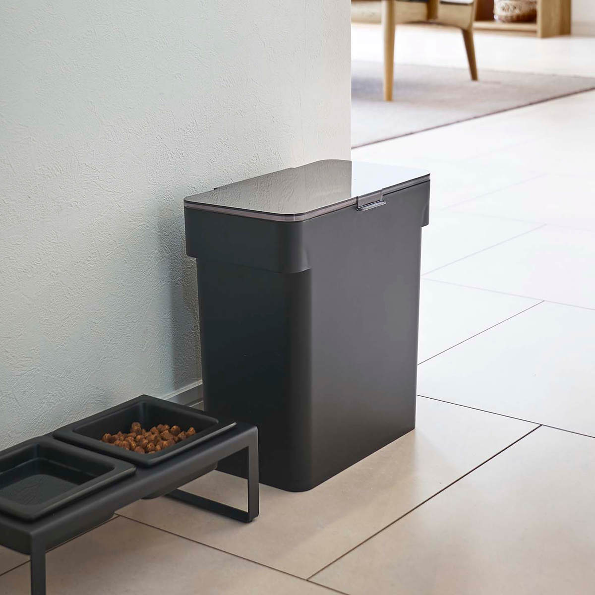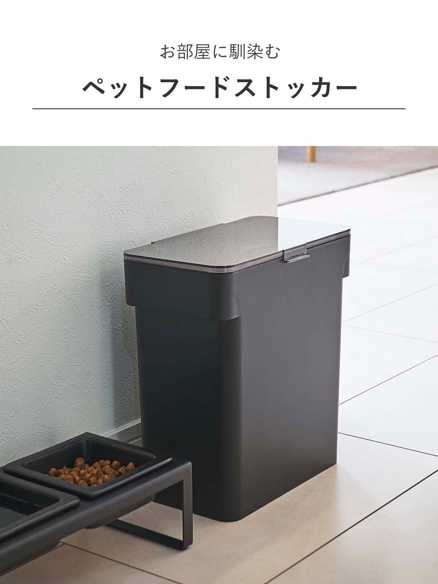 リビングやキッチンにそのまま置けるスタイリッシュなペットフードストッカーです。ドライペットフードを約4kg保存できます。パッキンでしっかり密閉されるので、ペットフードの湿気や酸化、臭い漏れを防いで品質を保ちます。