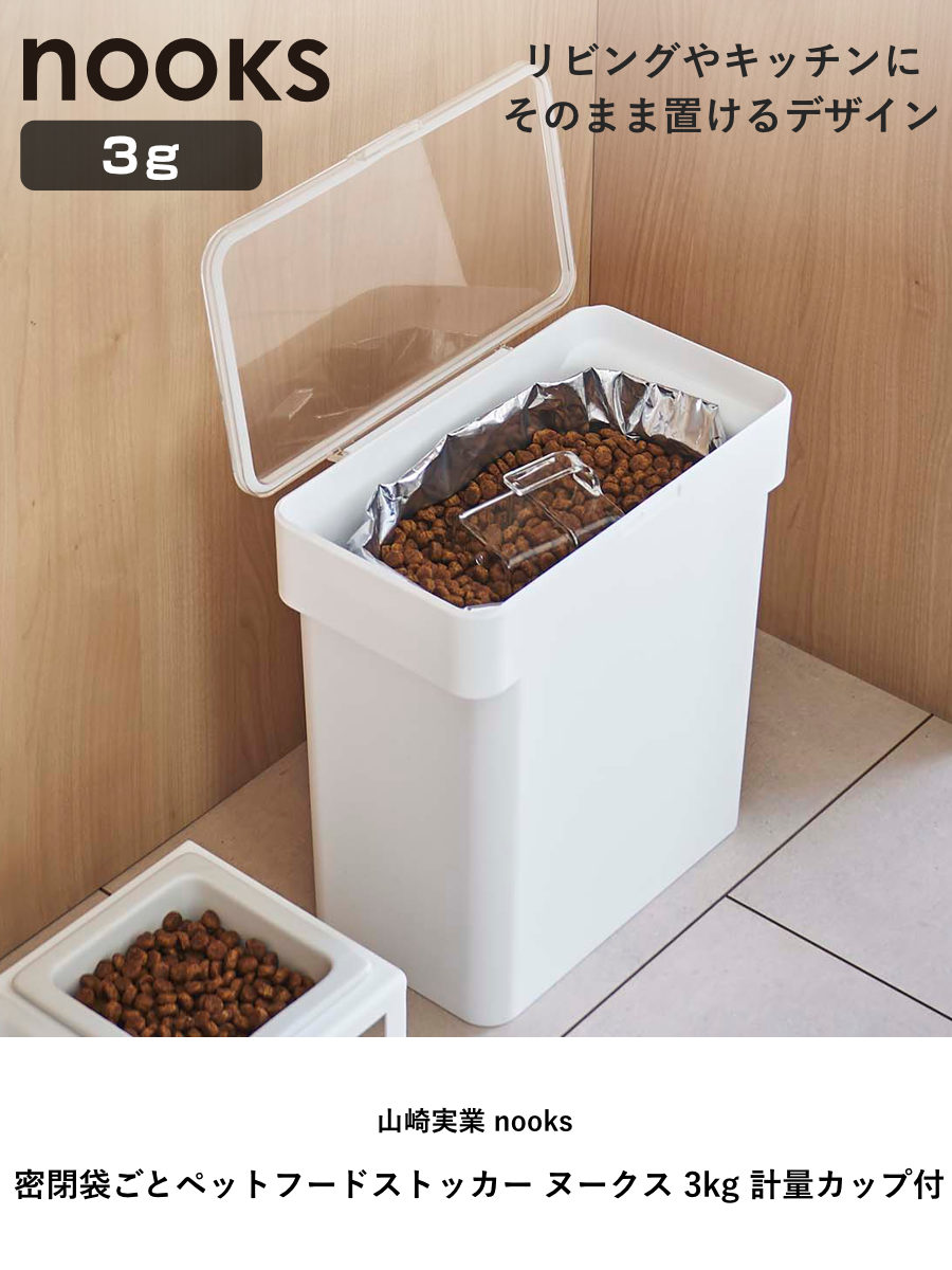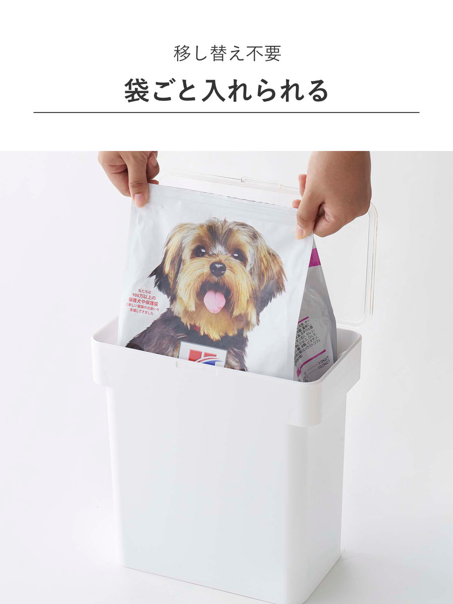 ペットフード約3kgの袋がスッポリ入るサイズです。ごはんの量が少なめの小型犬や猫を飼われてる方におすすめです。
