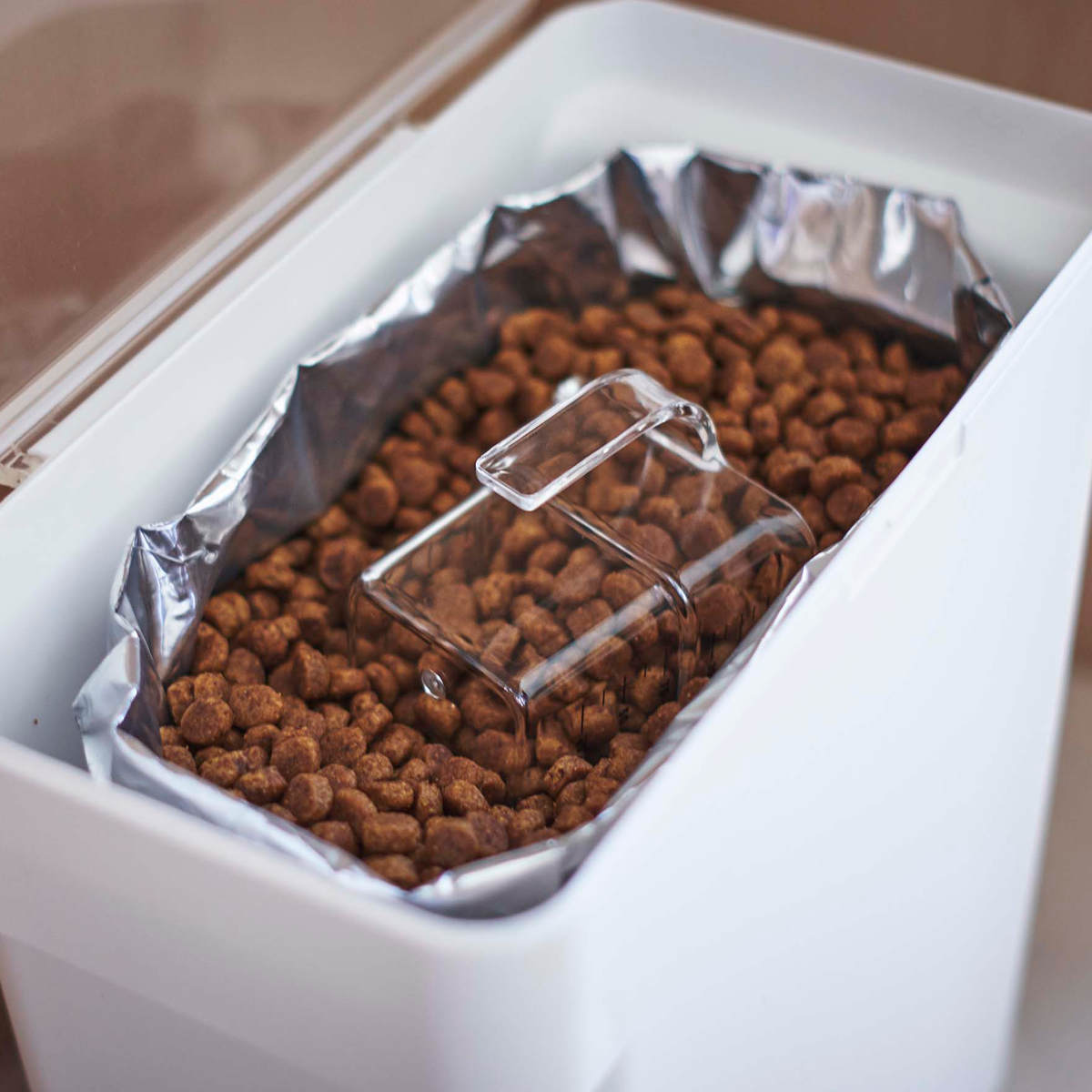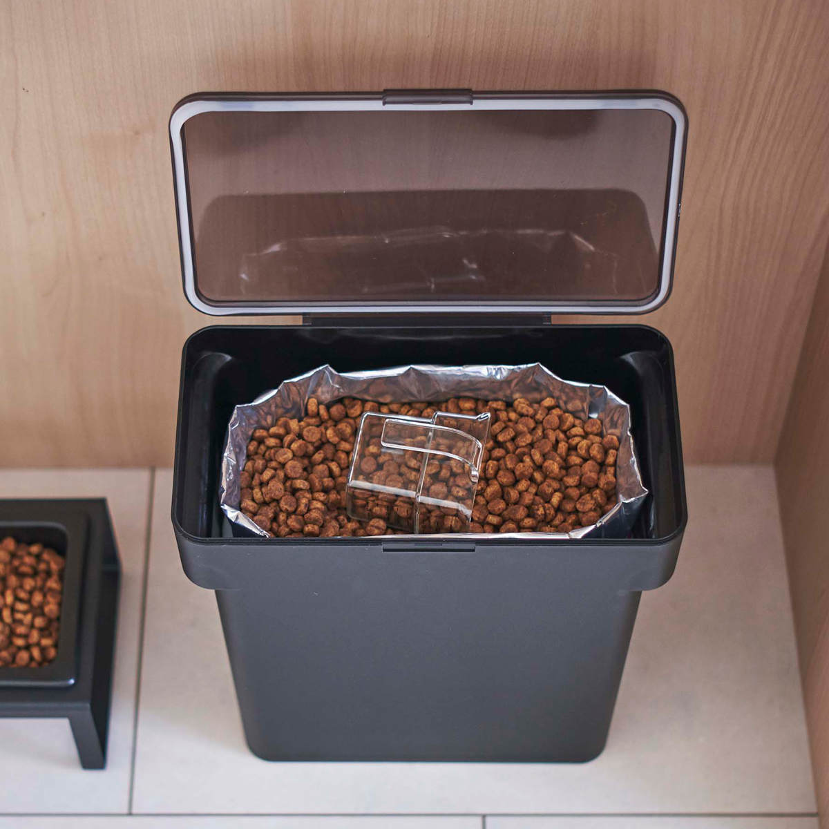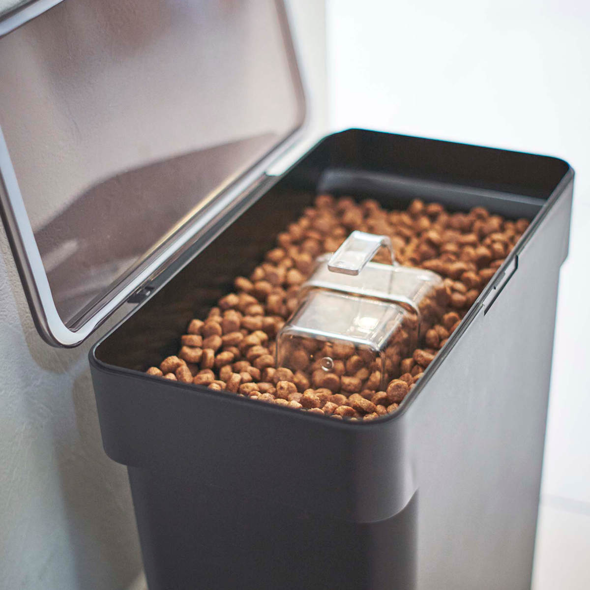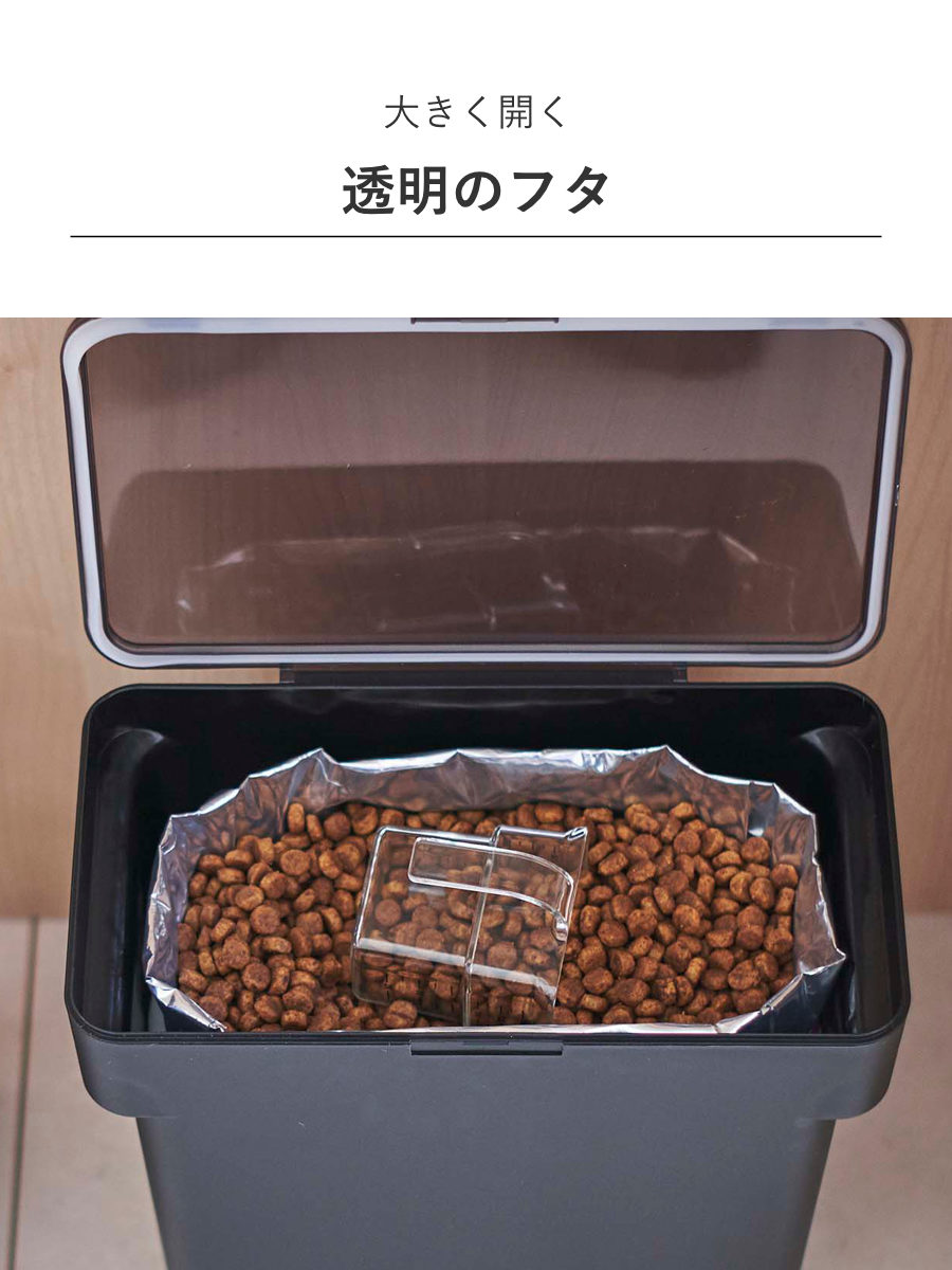 フタは全面に大きく開くので、ペットフードも取り出しやすく、補充の時もスムーズにできます。また透明フタなので閉めたままでも中の残量が一目で確認しやすく、補充のタイミングを見逃しません。