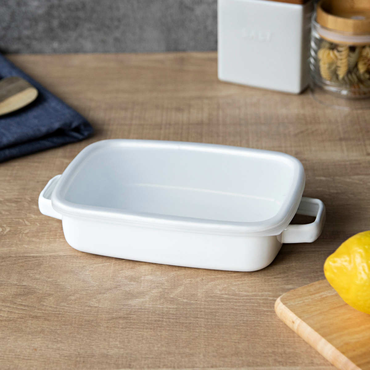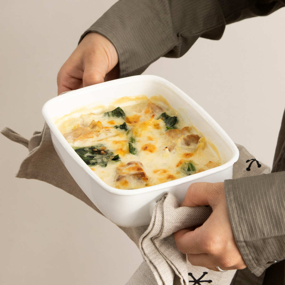 オーブンやトースターで調理したグラタンやラザニアをそのまま食卓へサーブして、出来立て熱々を味わえるホーロー容器です。保温性が高く冷めにくいので、煮込み料理などの温かいお料理の盛り付けにも最適です。作り置き用の保存容器として、オーブン料理の食器として、毎日使いやすいサイズです。