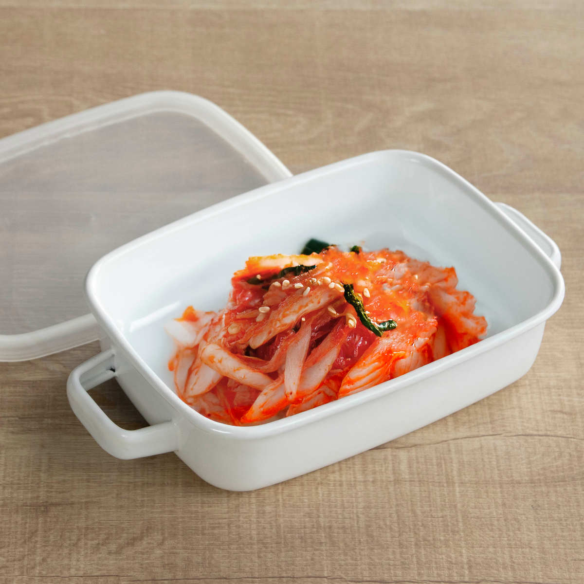 表面はガラス質で艶のある質感のホーロー容器は、酸や塩分に強く、汚れやニオイが付きにくいので、保存する食材を選ばず使用できます。フタ付きだから味噌やキムチなどの発酵食品の保存にもおすすめです。
