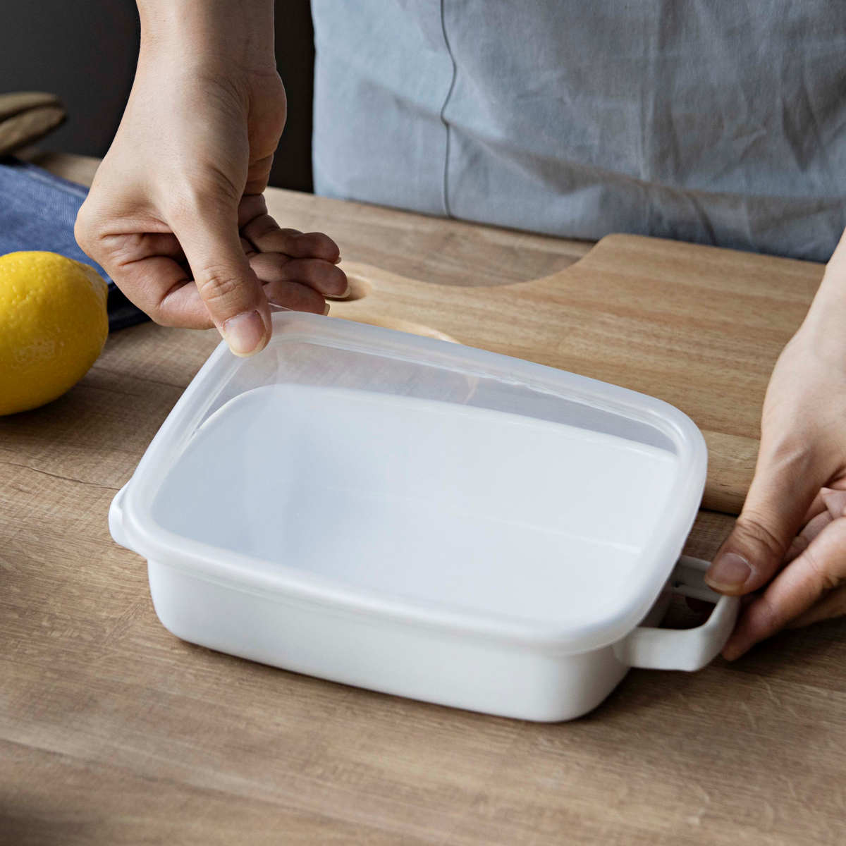 下ごしらえから調理、保存までできる浅型ホーロー容器は、幅広い用途で使用できます。お肉の漬け置きや、小麦粉やパン粉を付けるバットとして使用したり、揚げ物の後に油切りトレーとしても。
