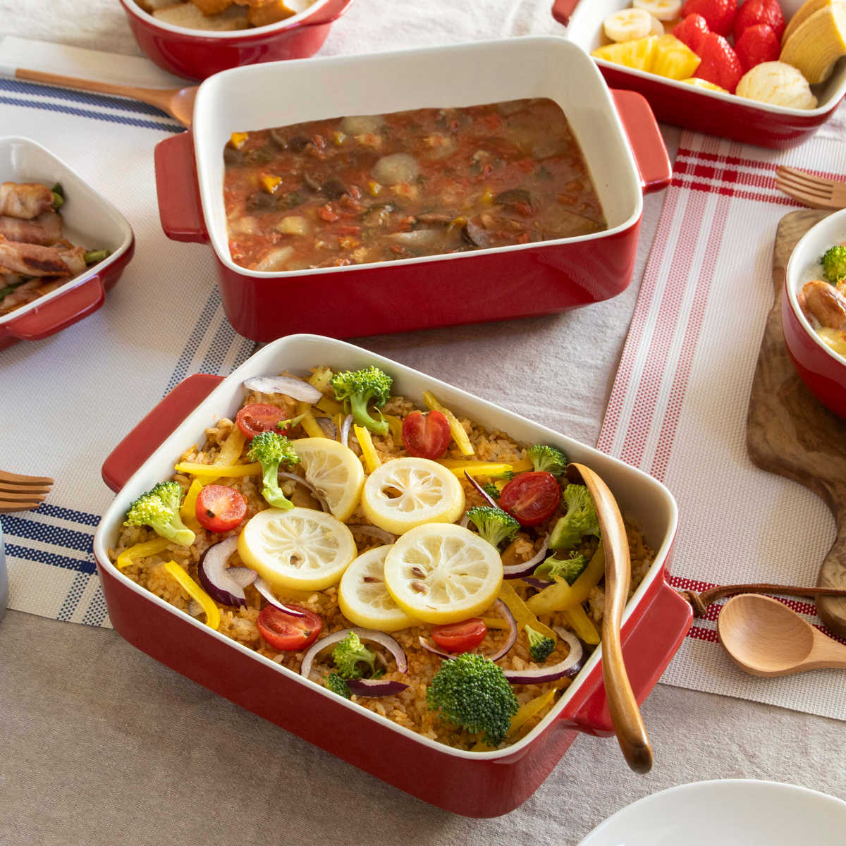 陶器ならではの温かみと赤と白のバイカラーが、ほっこりとした雰囲気の食卓を演出します。豊富なサイズバリエーションで家族の人数やその日のメニューによって使い分けができます。