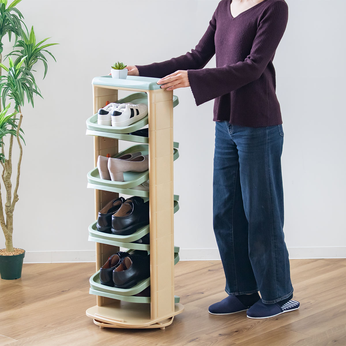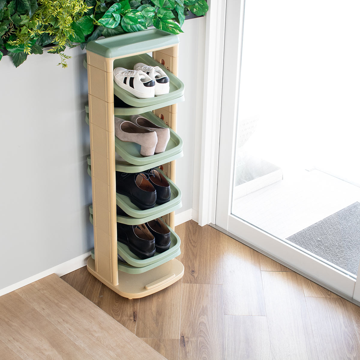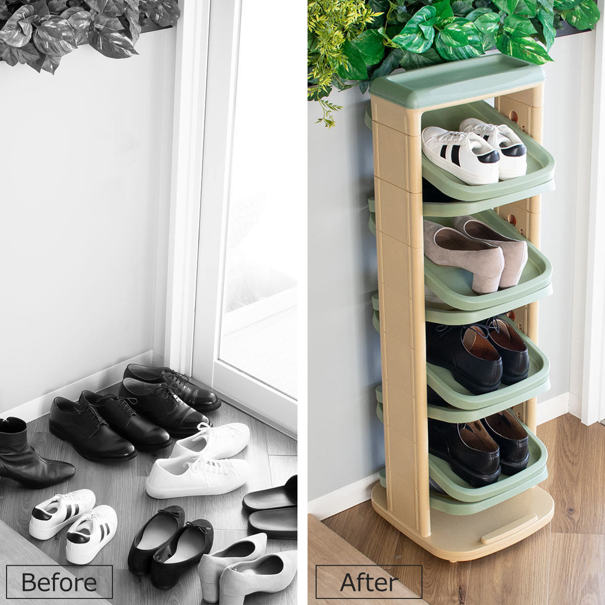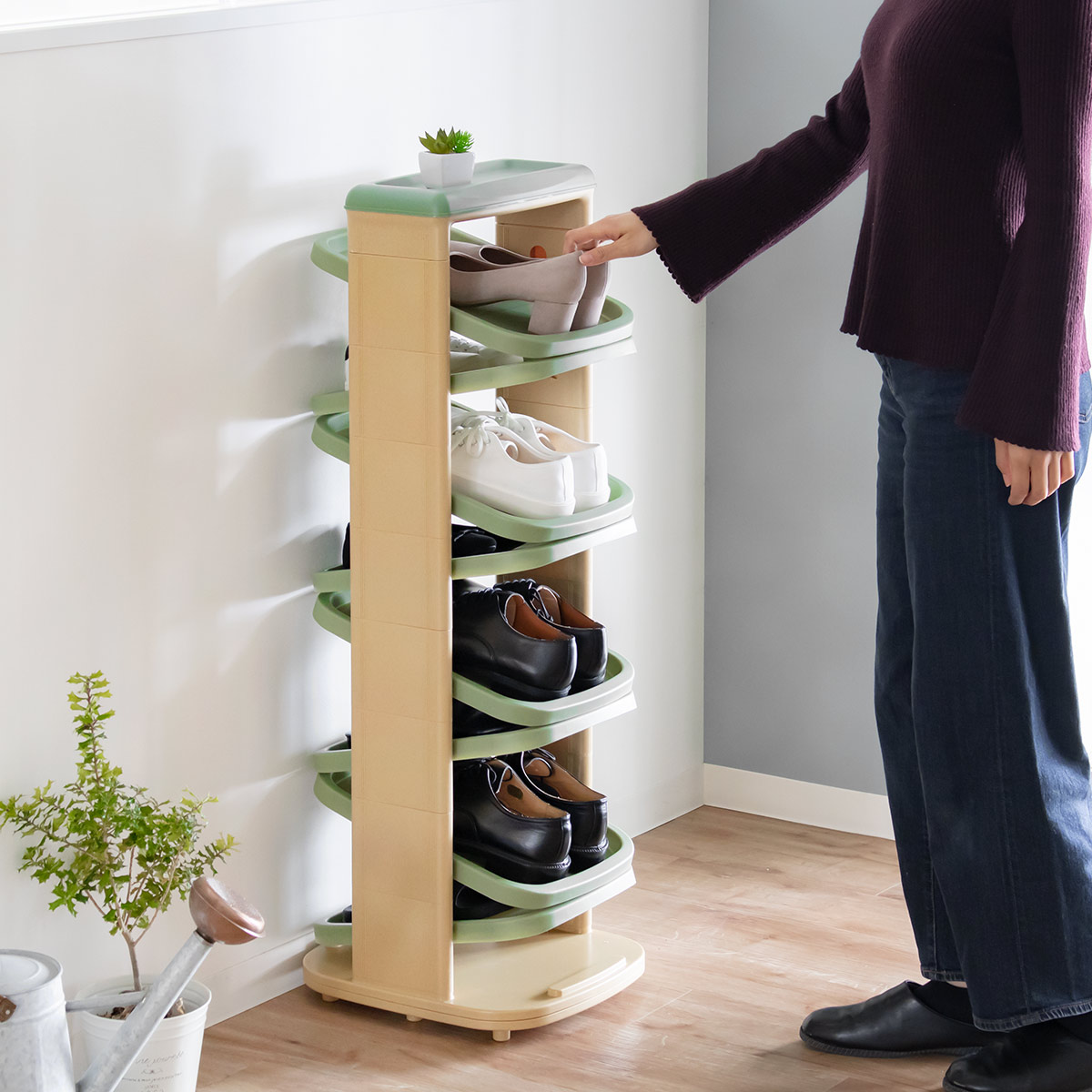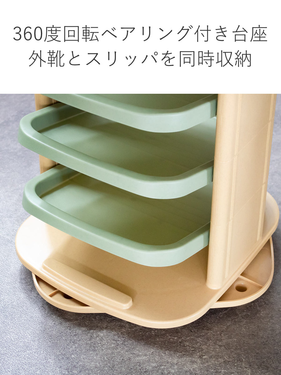 台座には360度回転するベアリングを採用しており、前後どちらからでも出し入れしやすい設計です。外靴とスリッパを分けて収納するなど、使い方の幅が広がります。