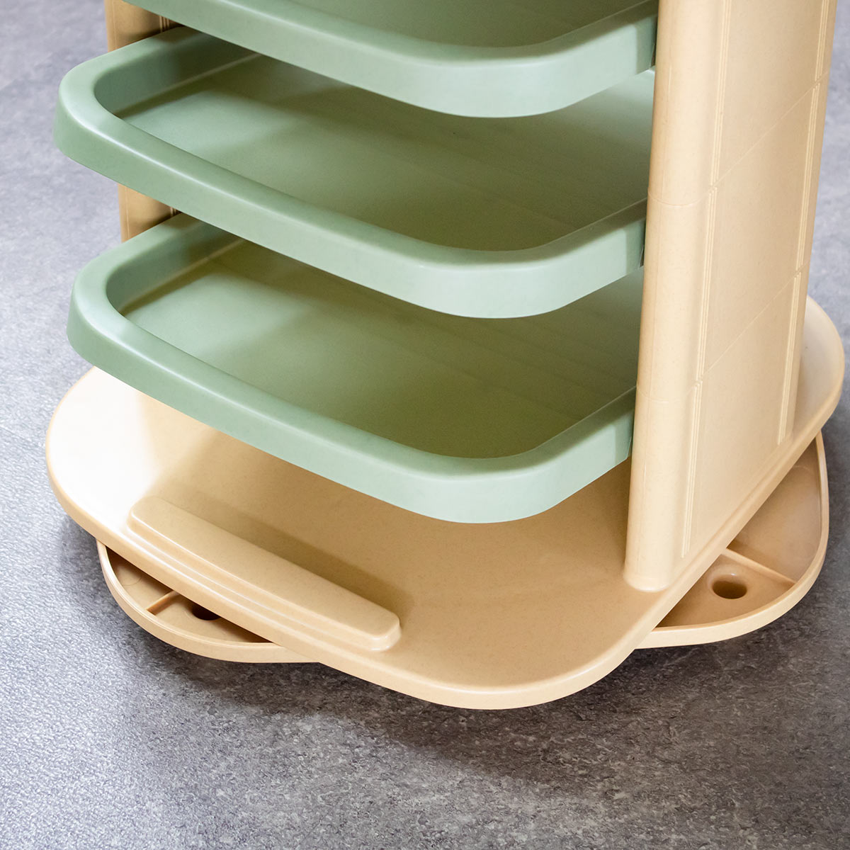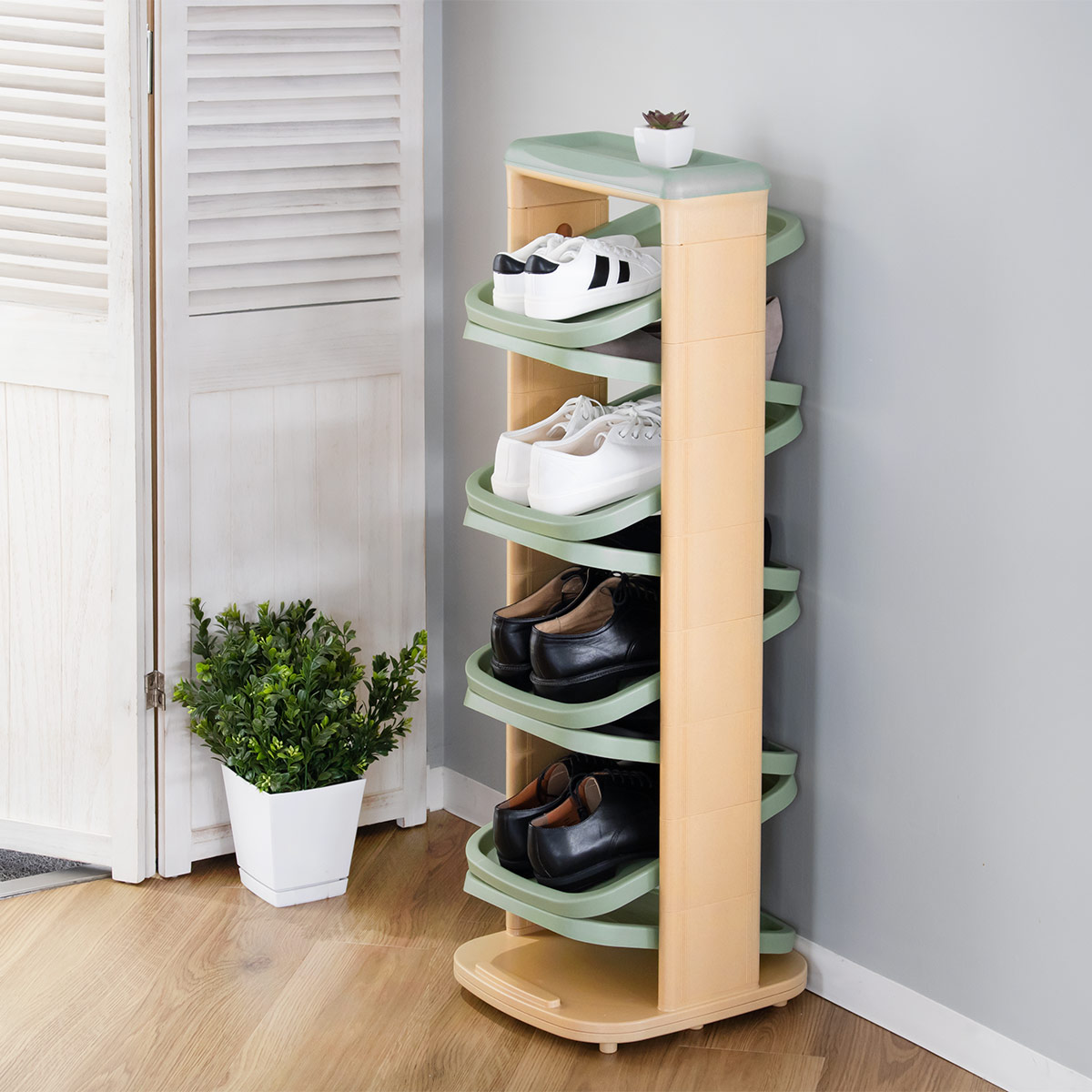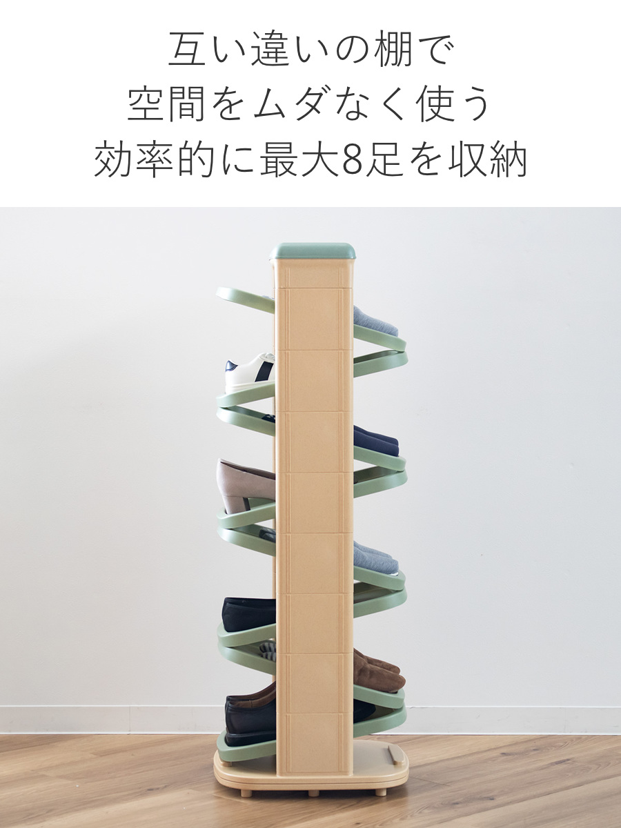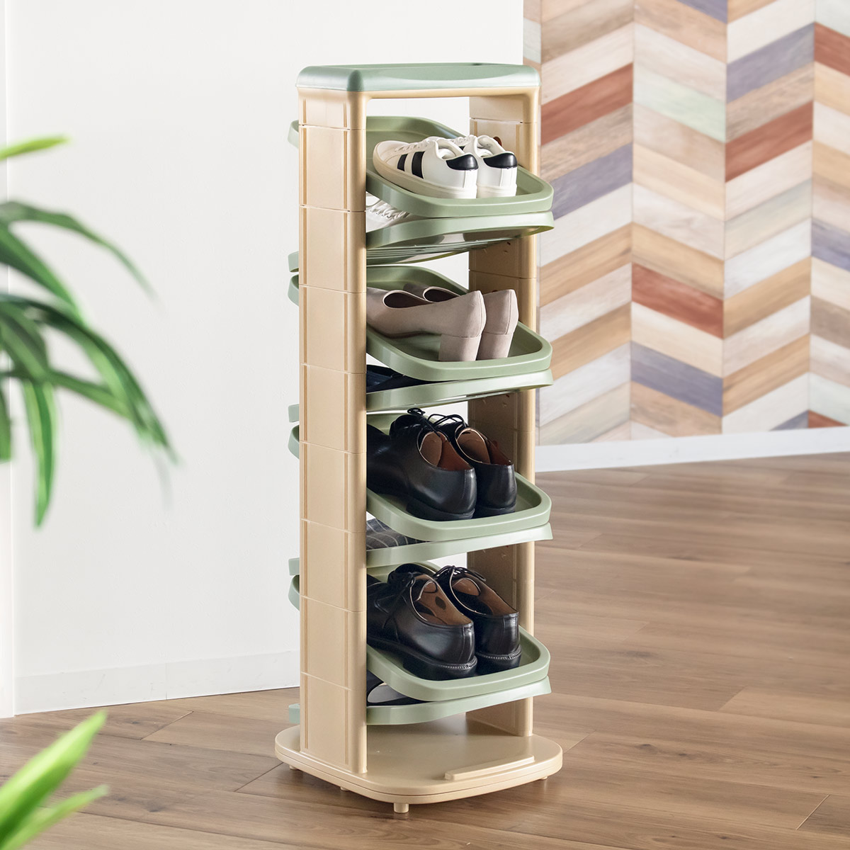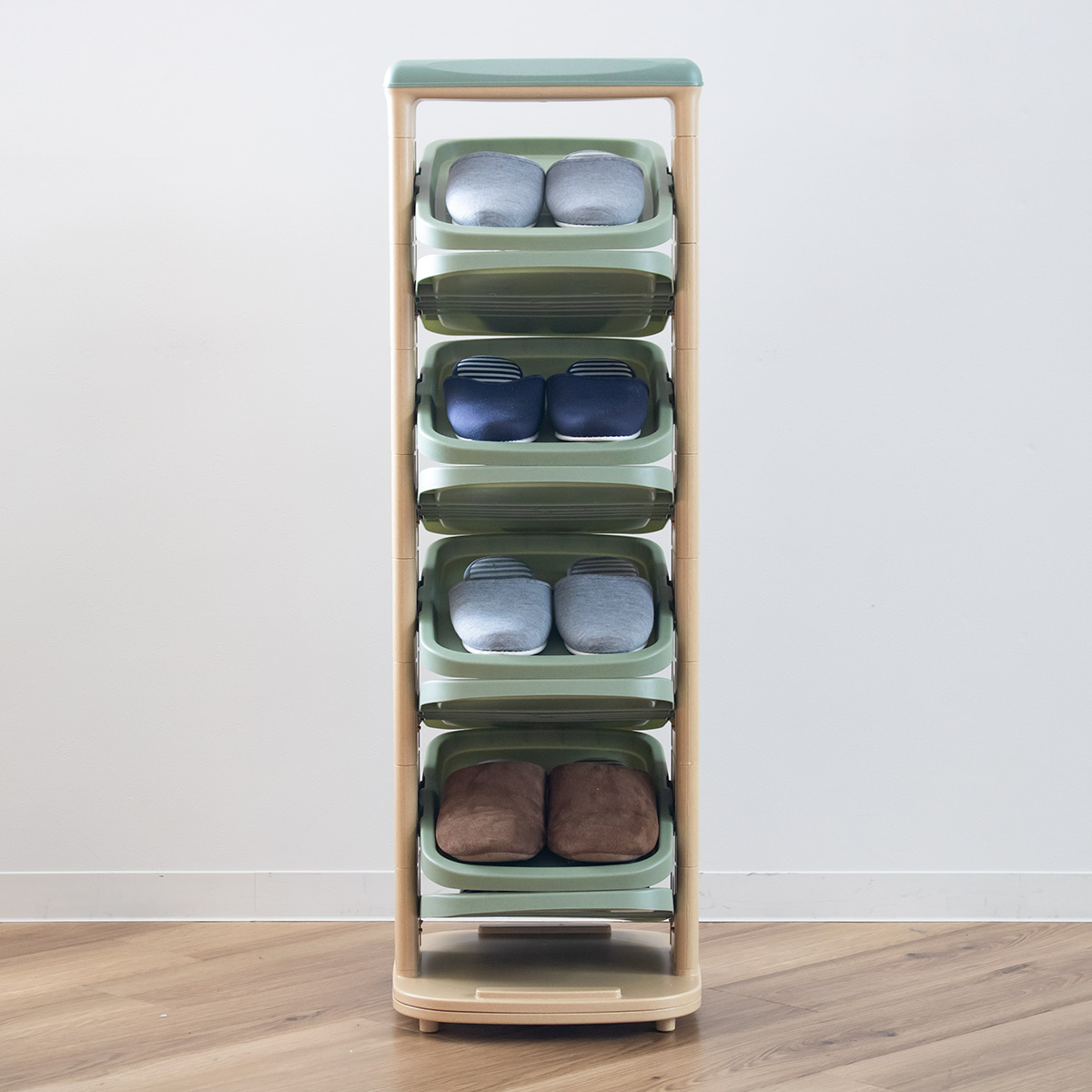 台座には360度回転するベアリングを採用しており、前後どちらからでも出し入れしやすい設計です。外靴とスリッパを分けて収納するなど、使い方の幅が広がります。
